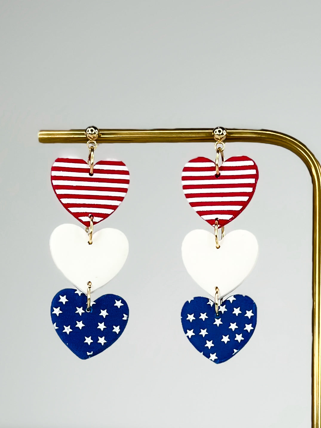 Add a touch of festive flair to your outfit with these Celebrating America Clay Drop Earrings. Featuring triple hearts in red, white, and blue, these earrings are the perfect way to show your patriotic pride.