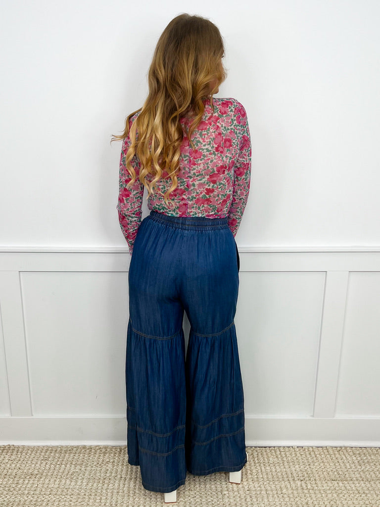 Step into comfort and style with these high-rise wide-leg bottoms in soft chambray! The playful tiered layers add a fun twist, while functional pockets keep your essentials close. An elastic waistband with a drawstring means you get the perfect fit every time—because who says comfy can’t be cute? Perfect for breezy days and easygoing vibes!