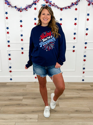 You're a Firework Cotton Blend Long Sleeve Navy Avery Mae Graphic Crewneck Sweatshirt (Bella+Canvas)