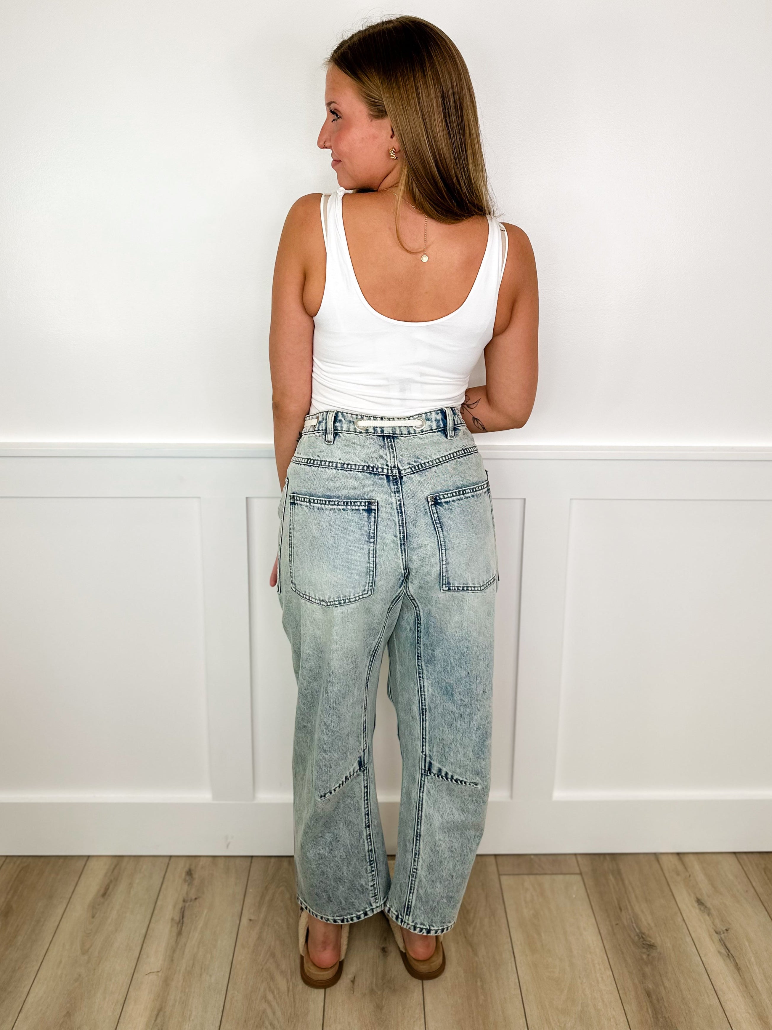 On the Daily High Rise Cotton Blend Barrel Leg Acid Wash Avery Mae Bottoms
