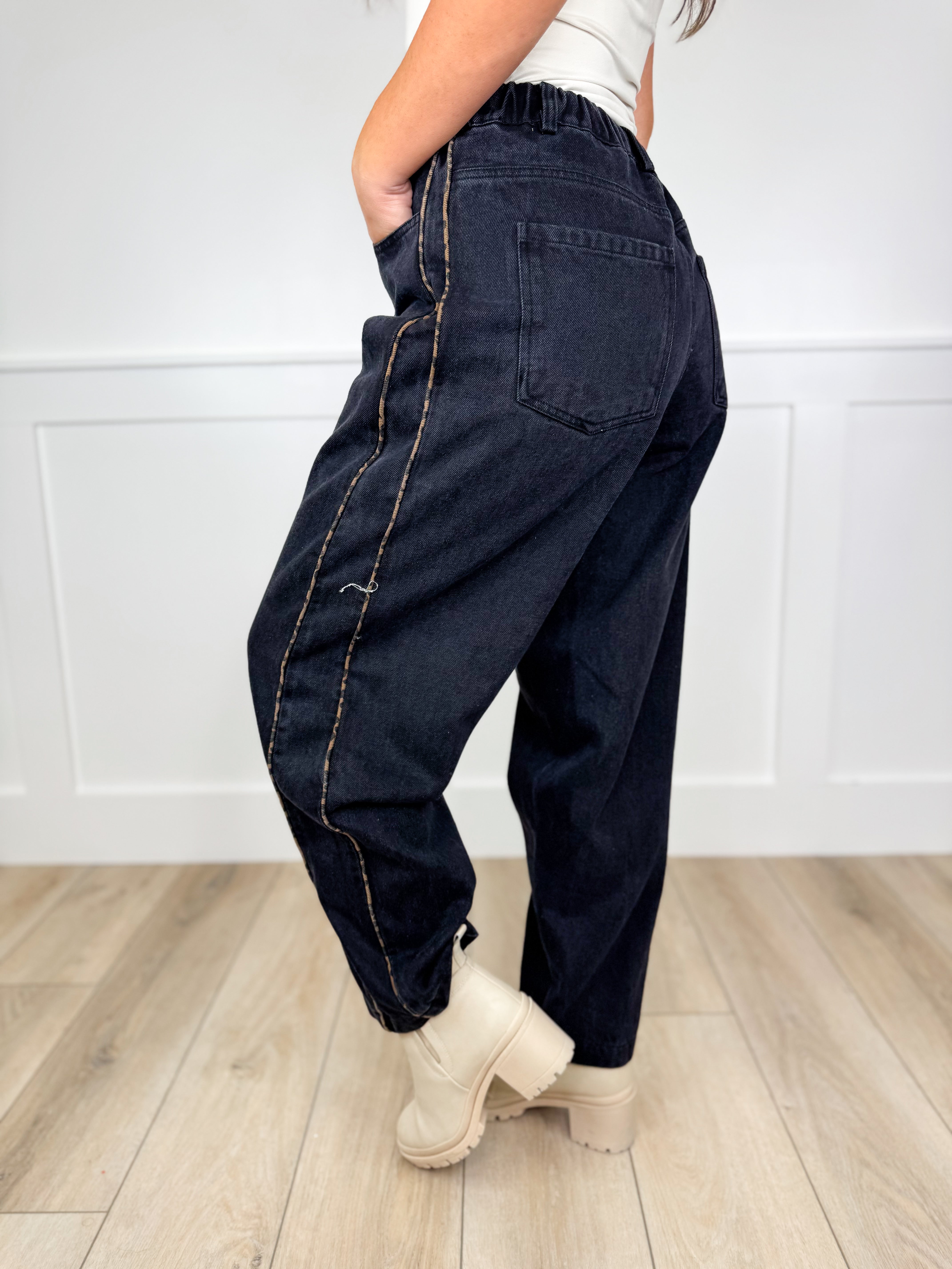 Step out in style with the Wild Whispers High Rise Barrel Jeans, crafted from a soft cotton blend in sleek black denim. These jeans feature playful leopard print piping along the sides, adding a fun and fierce twist to your everyday look. The high-rise fit and relaxed barrel shape deliver comfort and flattering curves, perfect for turning heads wherever you go.