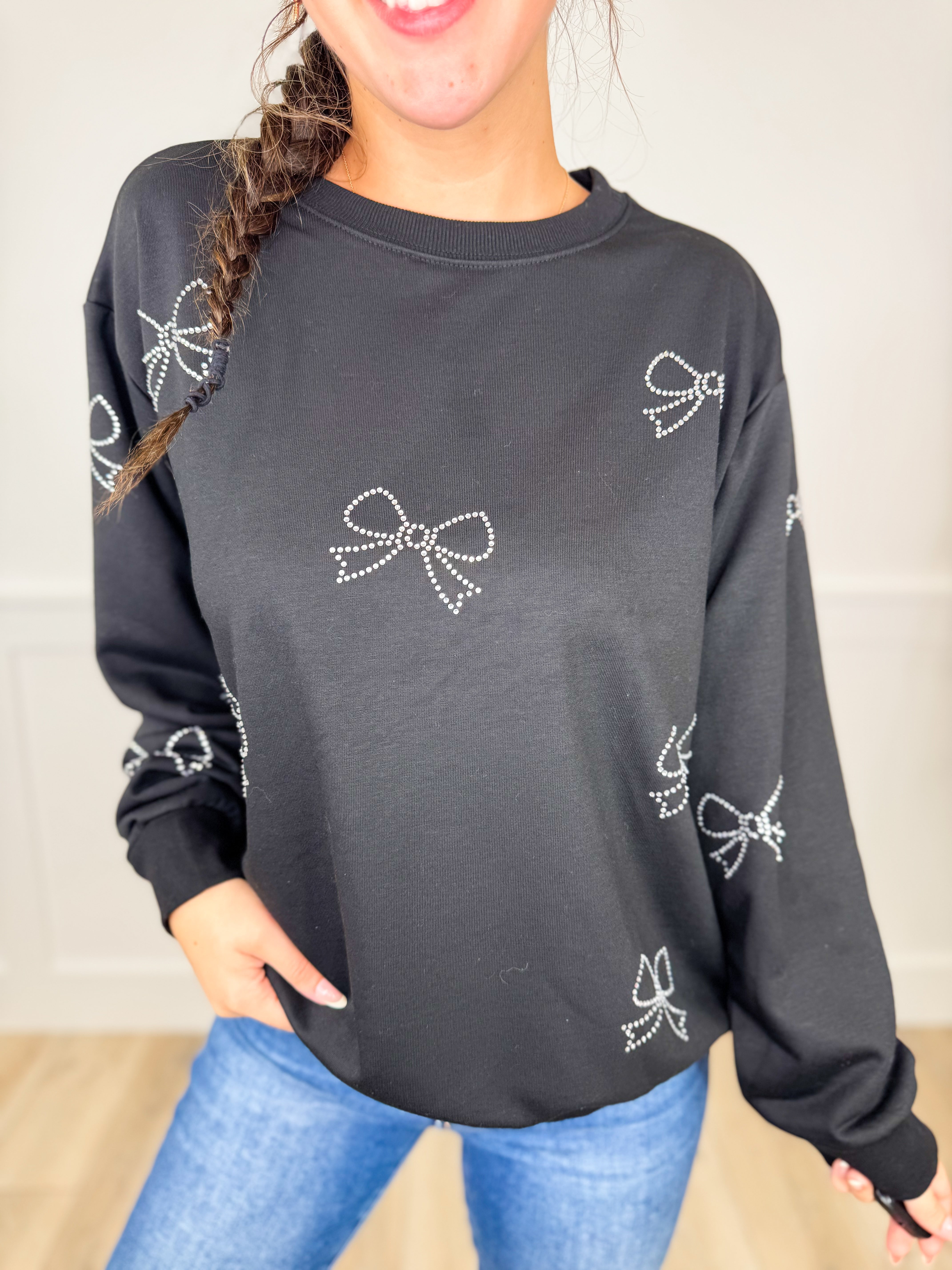 Elevate your casual style with this black long-sleeve top featuring a classic crew neck and charming gem-outlined bows that add just the right touch of sparkle. Made from a soft cotton blend, it’s as cozy as it is cute—perfect for days when you want to feel adored and effortlessly stylish.