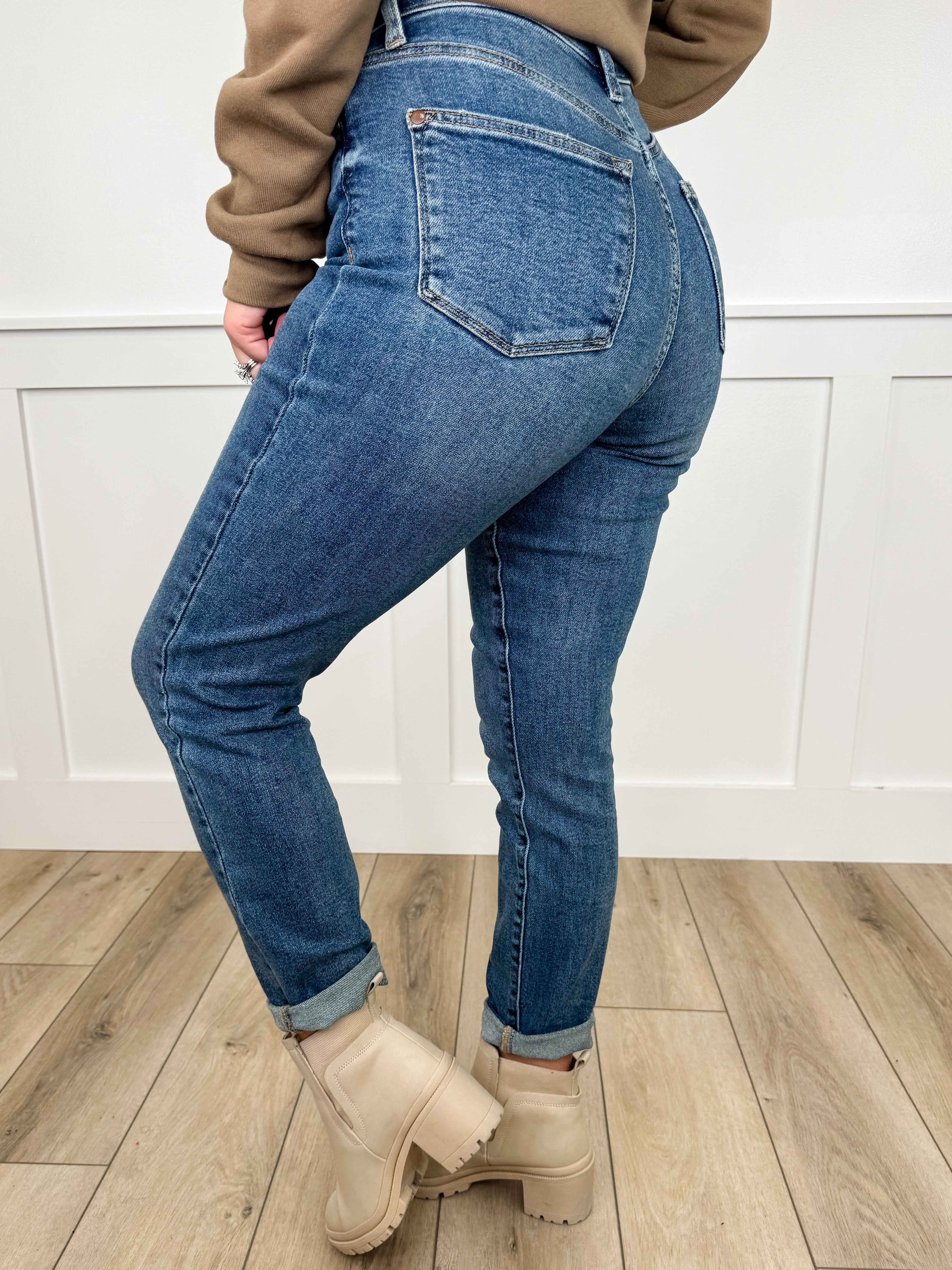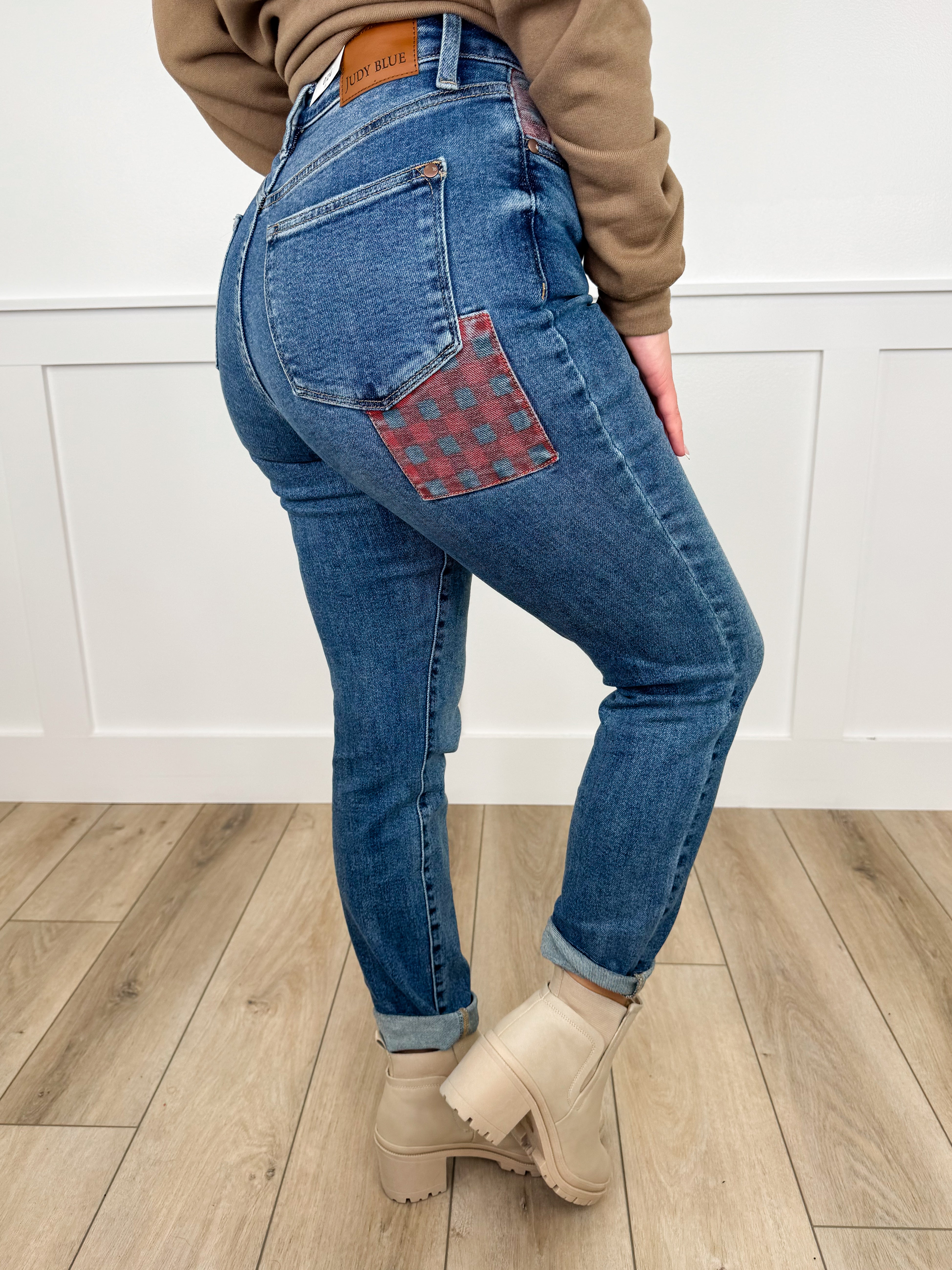 These Judy Blue Fallon High Rise Slim Fit Jeans blend classic denim with a playful twist. Featuring black and red buffalo plaid denim patches around the pockets, they add fun fall vibes without any distressing. The medium wash and slim fit create a flattering silhouette that's perfect for cozy autumn days.