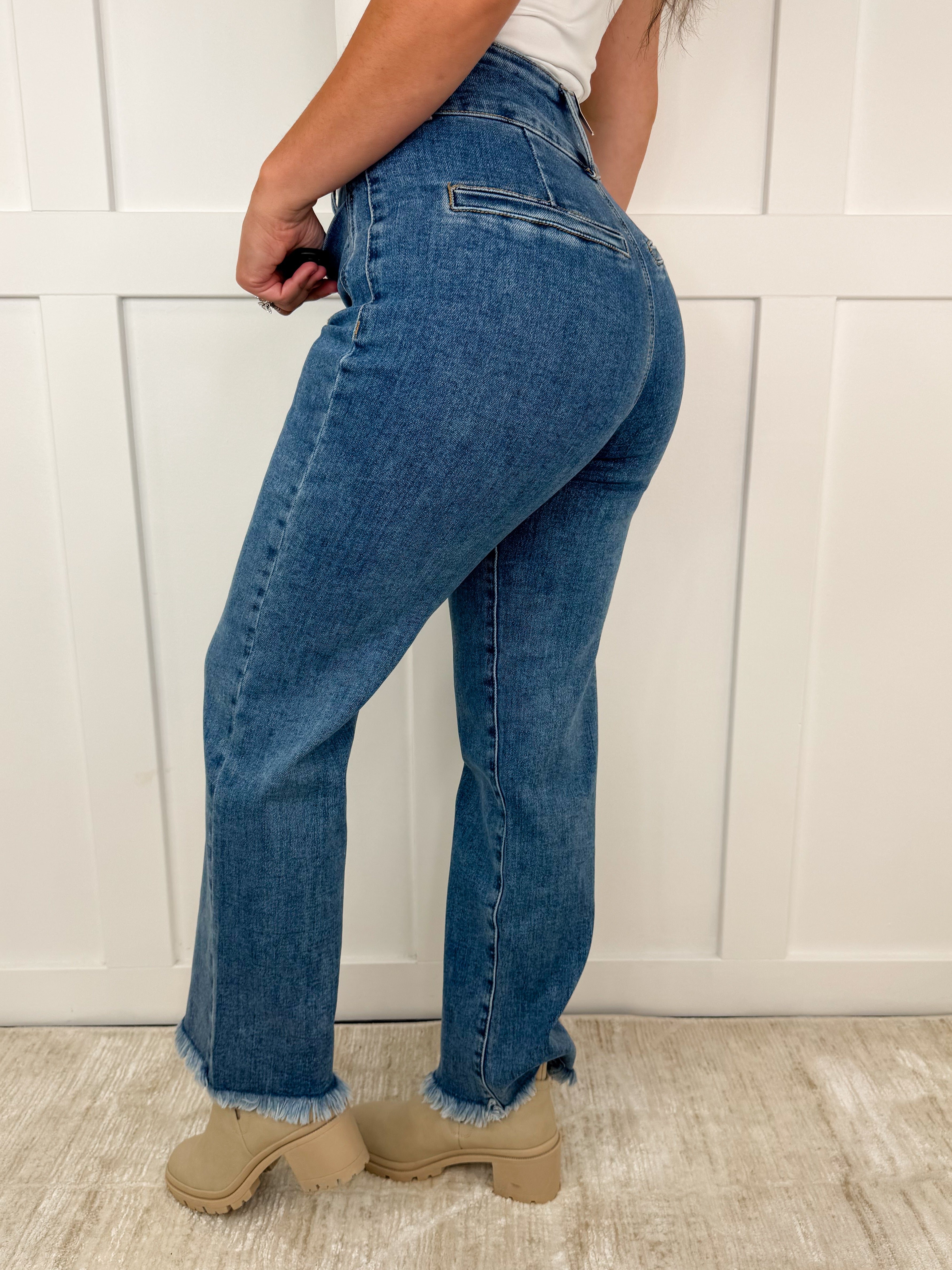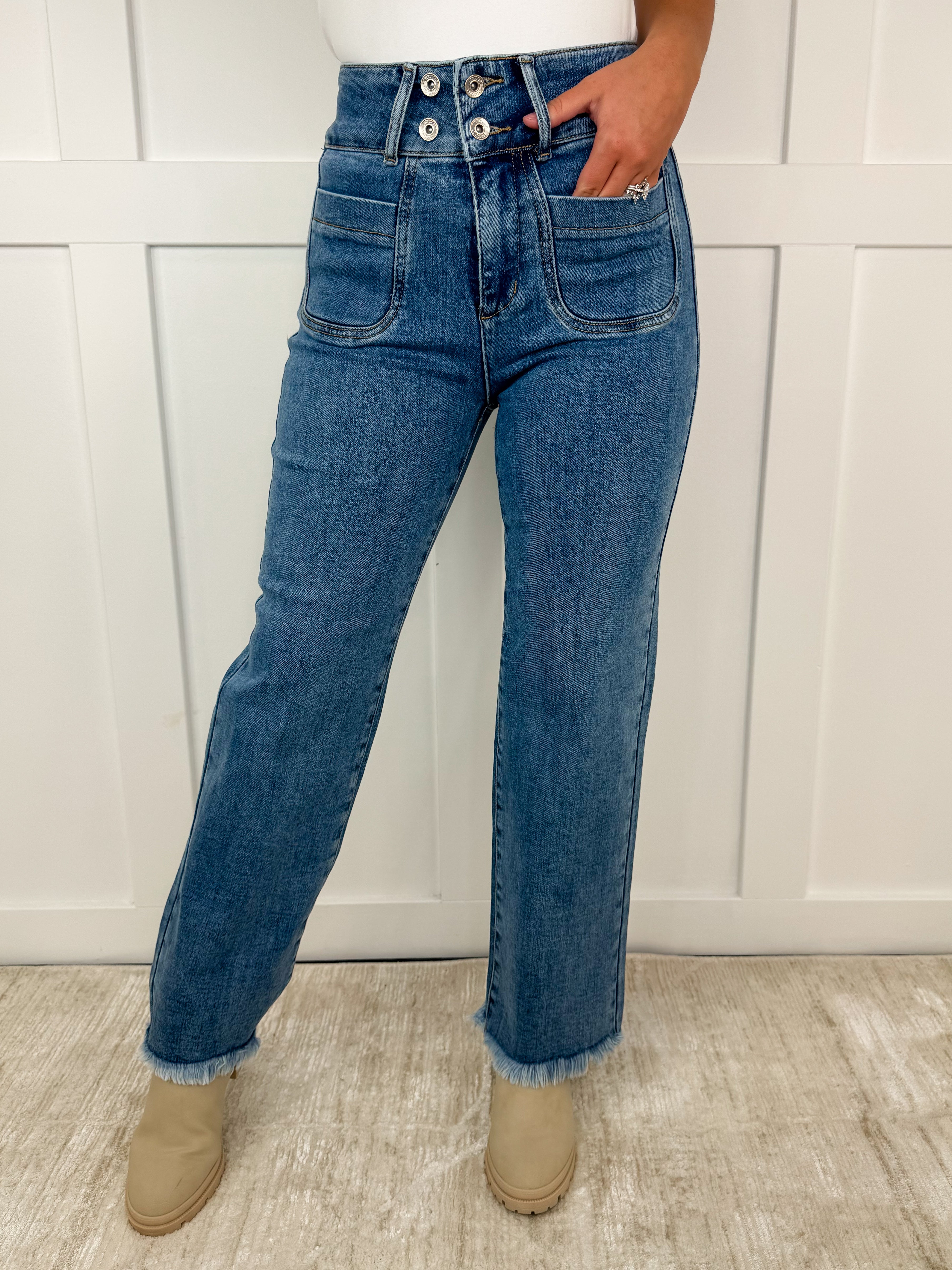 Step into style with the Marie High Rise Bootcut Jeans! These jeans feature a classic medium wash with a fresh, non-distressed look. Playful front pockets add charm, while the frayed hem brings a trendy edge. The quad button closure makes these jeans uniquely fun and perfect for adding a little flair to your everyday wardrobe.