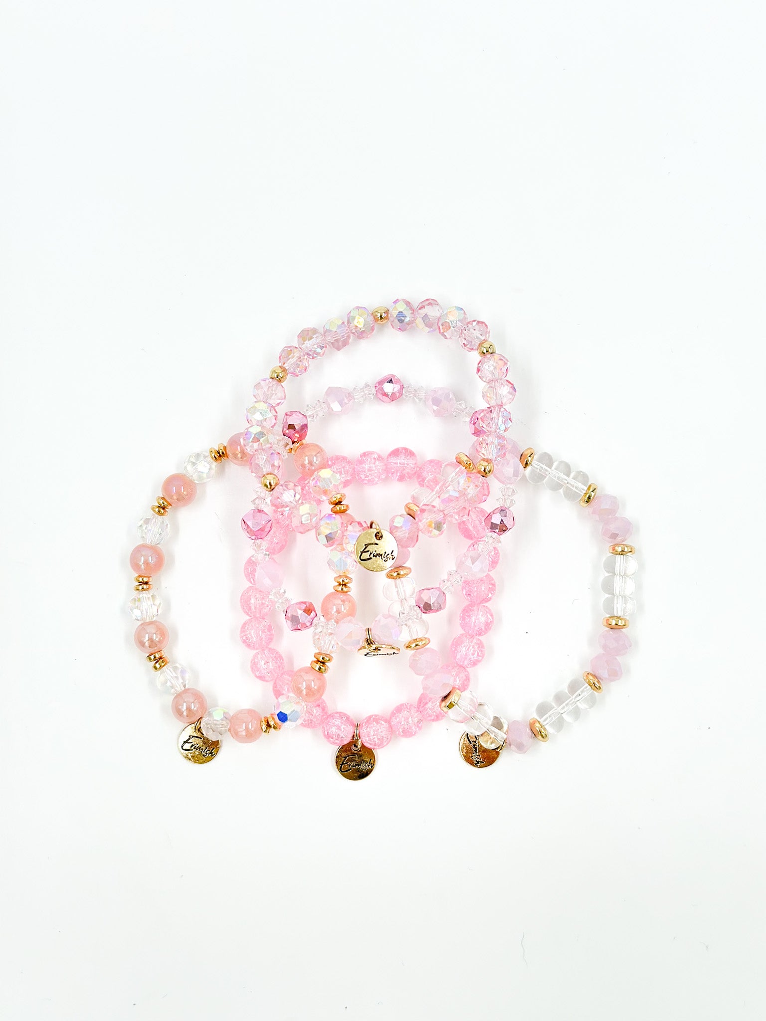 Stack your wrist with this adorable five-piece bracelet set featuring gorgeous gold and pink tones that work beautifully together. Each bracelet is crafted with genuine stone beads and has handmade pieces that are perfect for layering or wearing individually. The unique nature of each set means your colors and bead sizes will be one-of-a-kind, making this the perfect accessory for anyone who loves a touch of sparkle and charm.