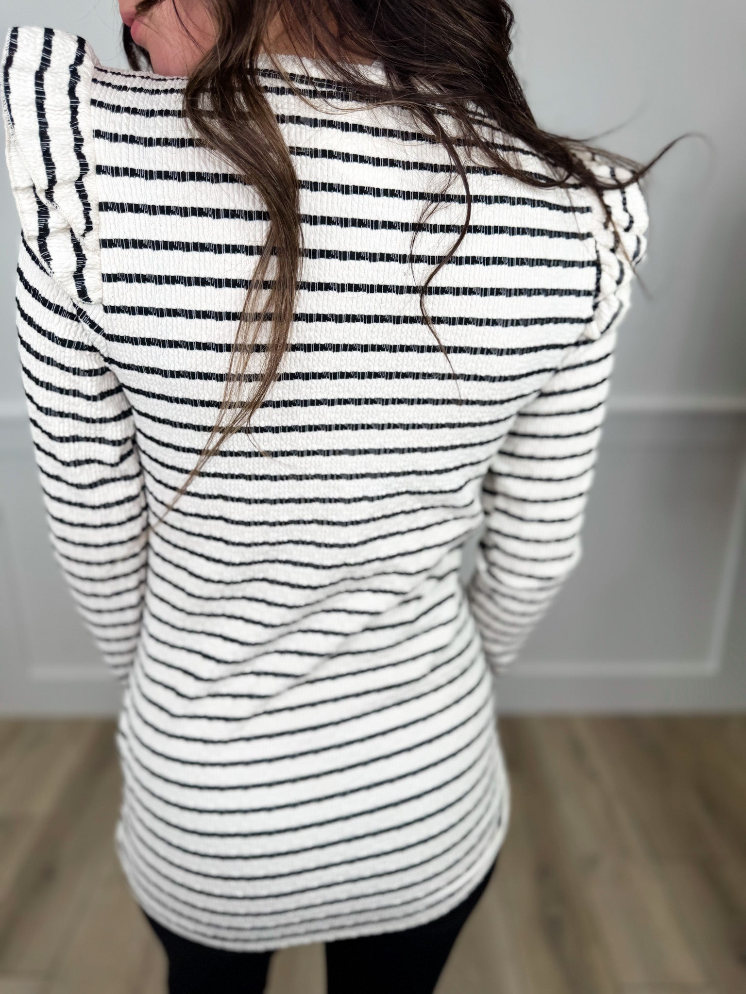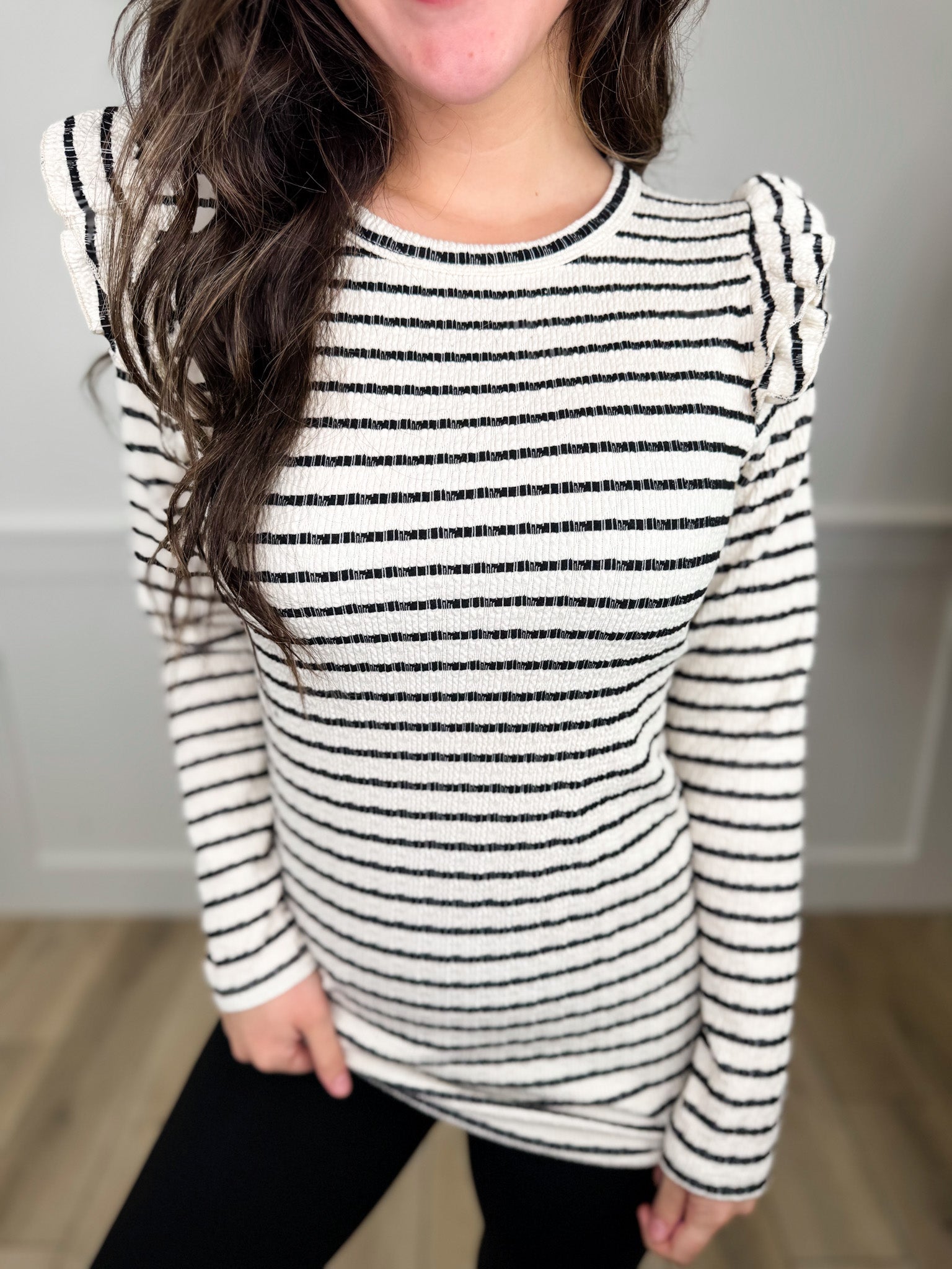 Strut your stuff in this playful ribbed long sleeve that's anything but basic. Ivory fabric gets a chic upgrade with bold black stripes running through, while ruffled shoulders add just the right amount of sass and dimension. The fitted ribbed design hugs in all the right places, making this top perfect for layering or wearing solo.