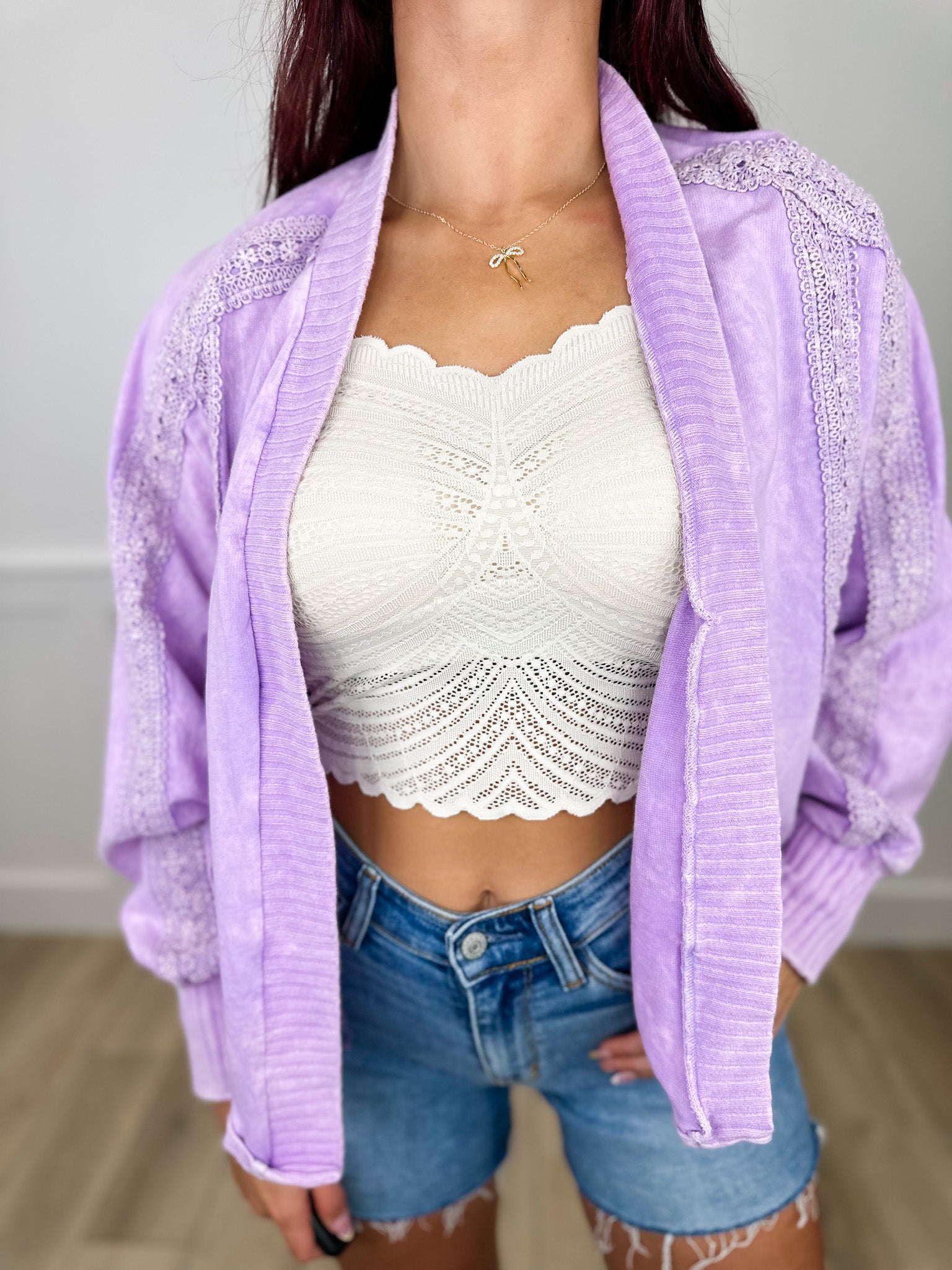 Wrap yourself in dreamy lilac with this lightweight cardigan featuring delicate lace detailing on the sleeves. The soft cotton blend fabric makes it perfect for layering, whether you're dressing up a casual outfit or adding a cozy touch to your favorite dress. Playful, pretty, and endlessly versatile—your new wardrobe essential awaits.