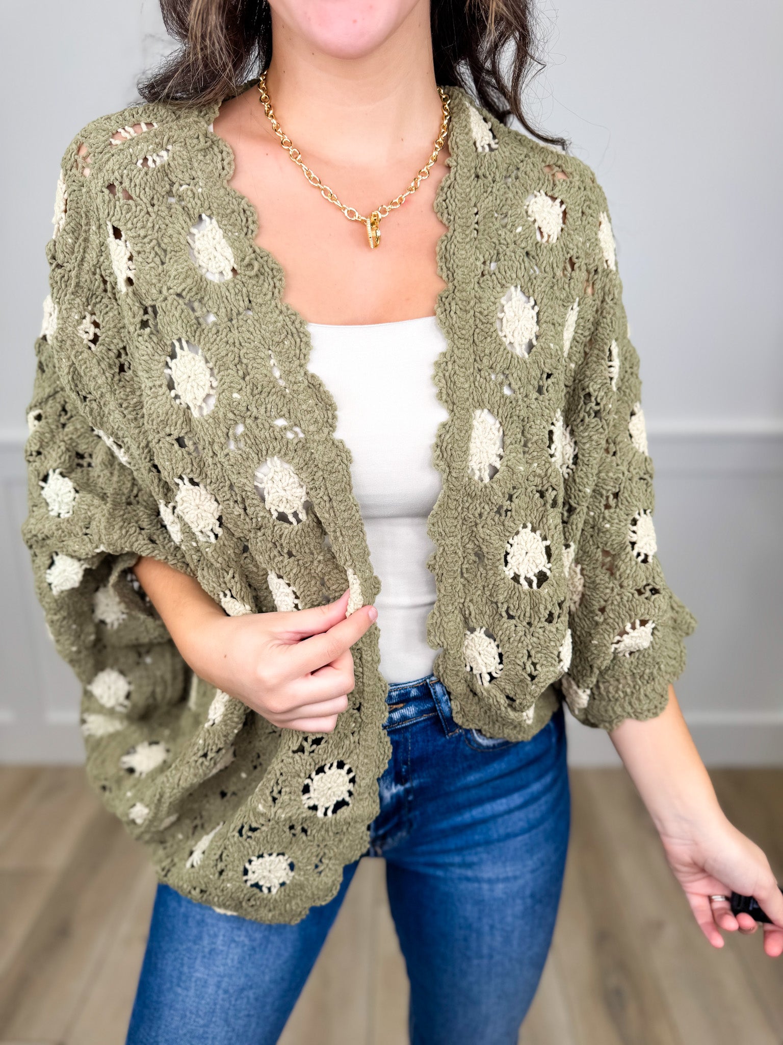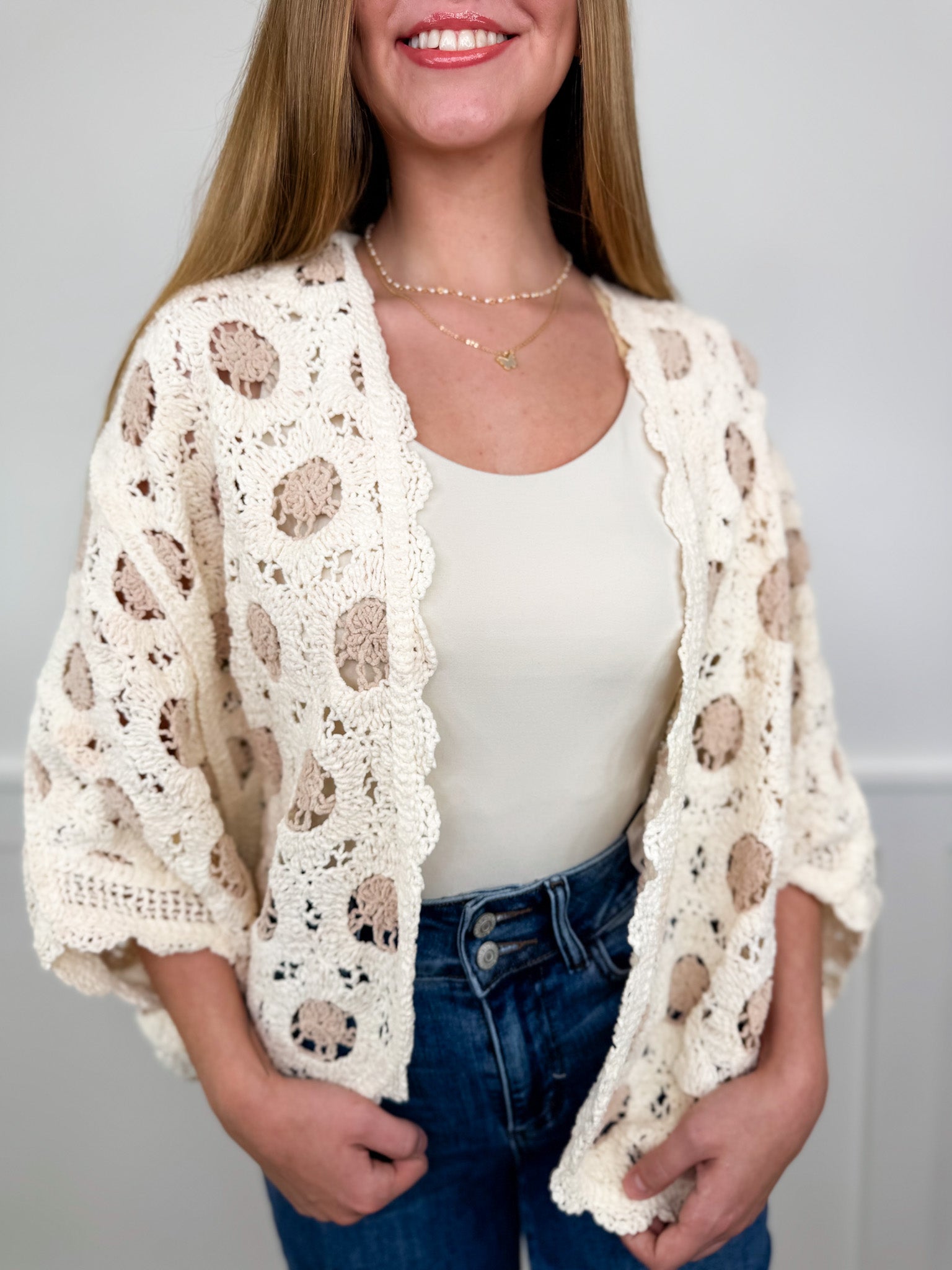 Cozy meets bold in this crochet chenille cardigan featuring a playful batwing silhouette that moves with you. The contrasting floral pattern detailing adds a fun twist to your outfit, making every entrance unforgettable. Perfect for layering, this 3/4 sleeve piece brings warmth and charm in equal measure. Available in three colors to suit your mood!