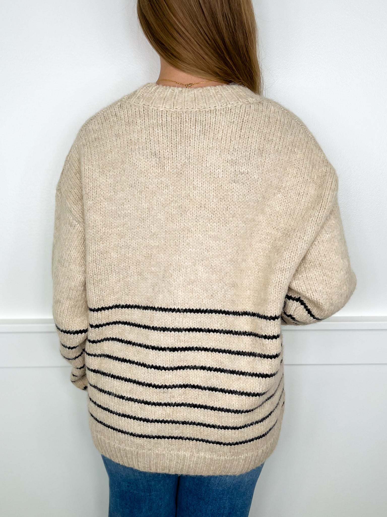 Cozy meets cool in this oversized oat cardigan featuring playful stripes for a fresh twist on your layering game. Perfect for lounging or stepping out, its relaxed fit and button-up style make it your new go-to for effortless comfort with a dash of fun.