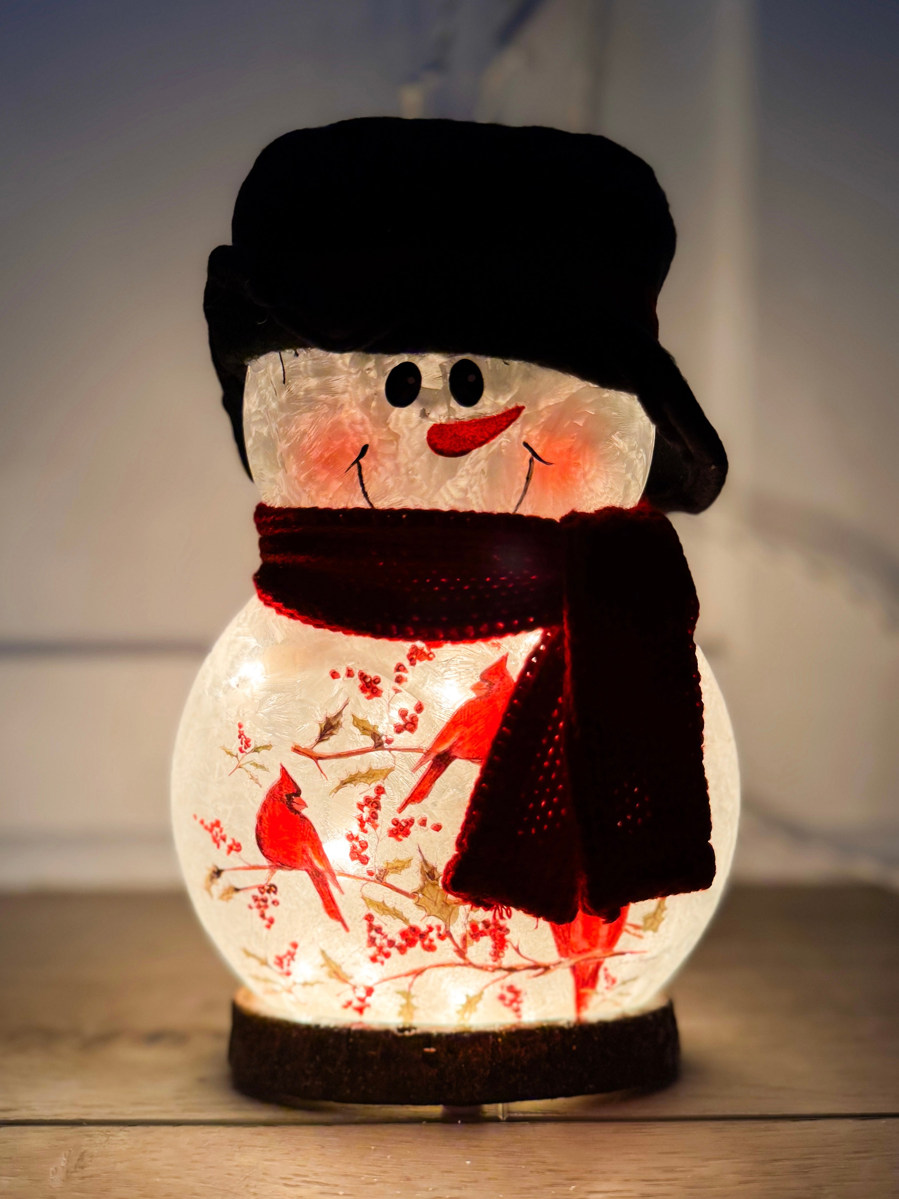 Bring a touch of winter magic to your space with the Feather & Frost Snowman Light Up Decor. This frosted glass snowman, complete with a charming top hat and cozy scarf, glows warmly when plugged in. Delightful cardinal details add a splash of festive color, making it the perfect playful accent for your holiday decorating.