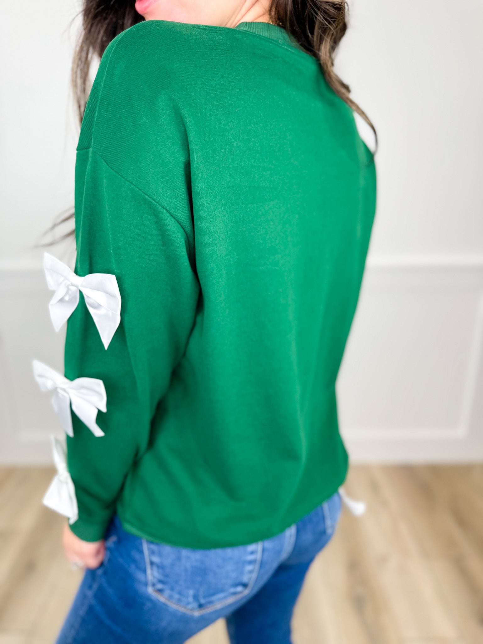 This playful long sleeve top brightens your wardrobe with a fresh green hue and charming white bows tied to each sleeve. Crafted from a soft cotton blend, it offers comfort with a fun, flirty twist. Perfect for adding a touch of whimsy to any casual or dressy look, it’s an easy way to stand out while staying cozy all day.