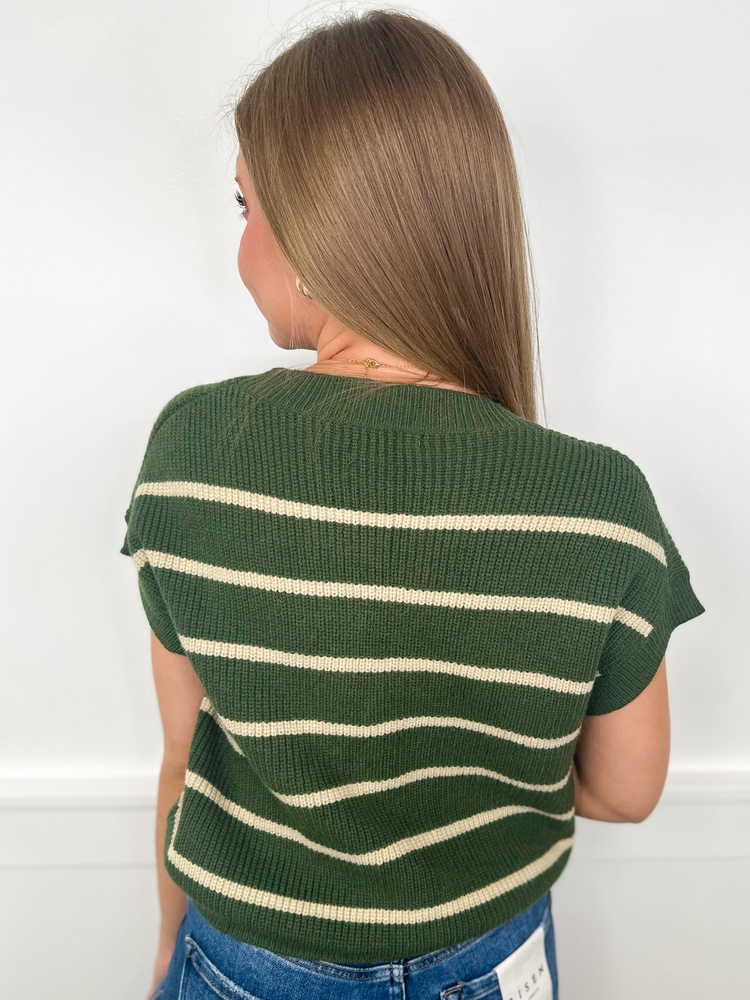 Embrace cozy vibes with this playful green striped knit top, perfect for fall. Its short sleeves keep it light and breezy, while the soft knit fabric adds warmth for those crisp autumn days. A fun and stylish choice to brighten up your seasonal wardrobe!
