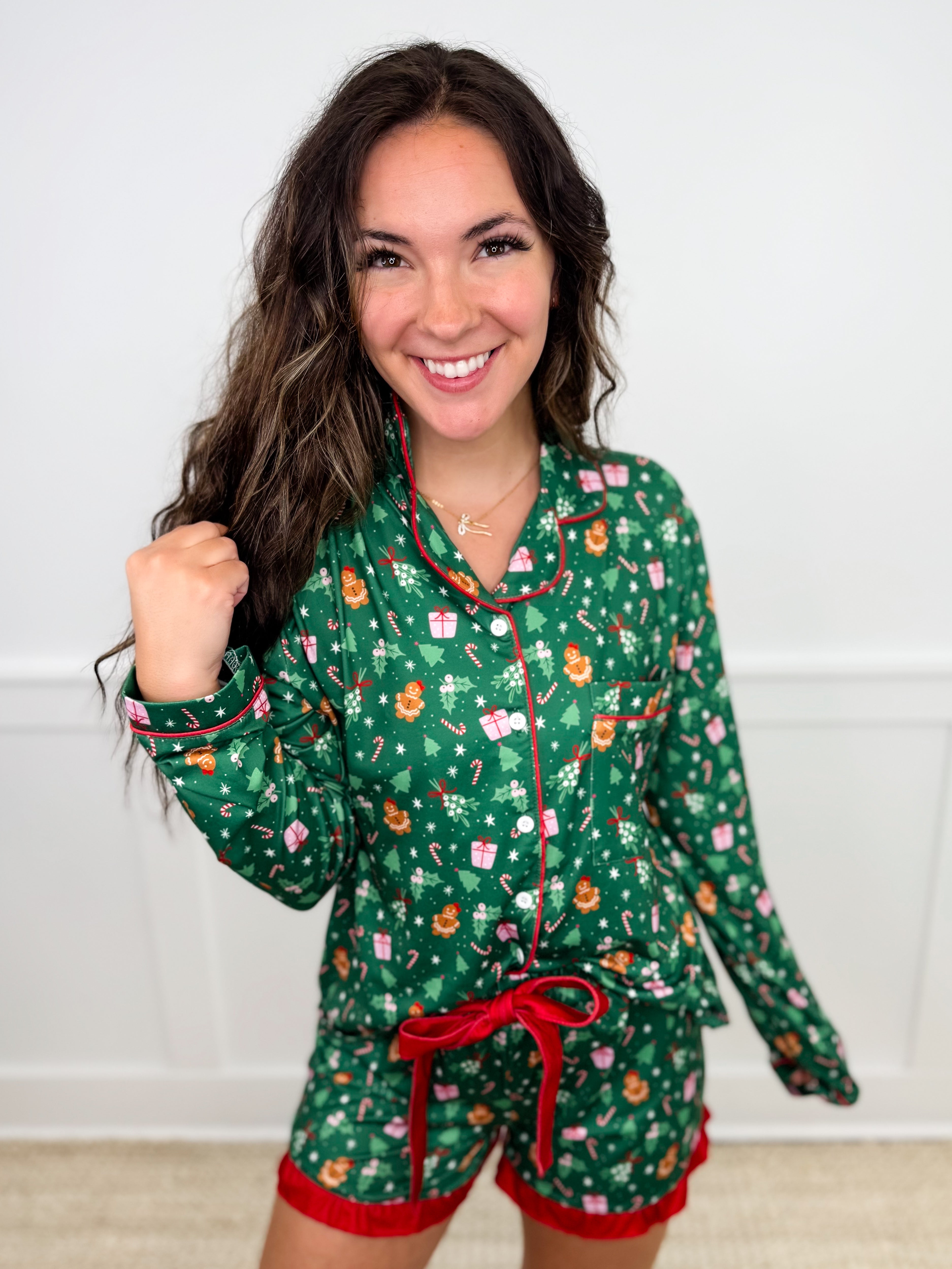 Get into the holiday spirit with our Tidings of Joy PJ Set! This Christmas print set features a cute long sleeve top and matching shorts for a cozy night in. Spread some joy and relax in style with our Avery Mae design.
