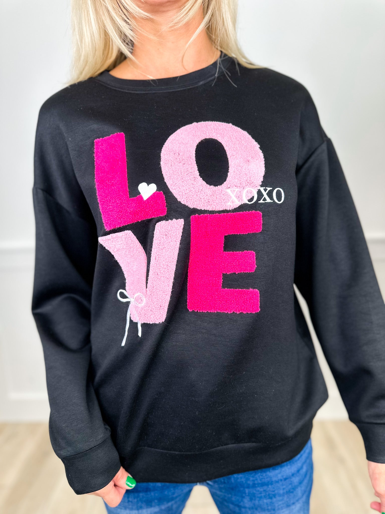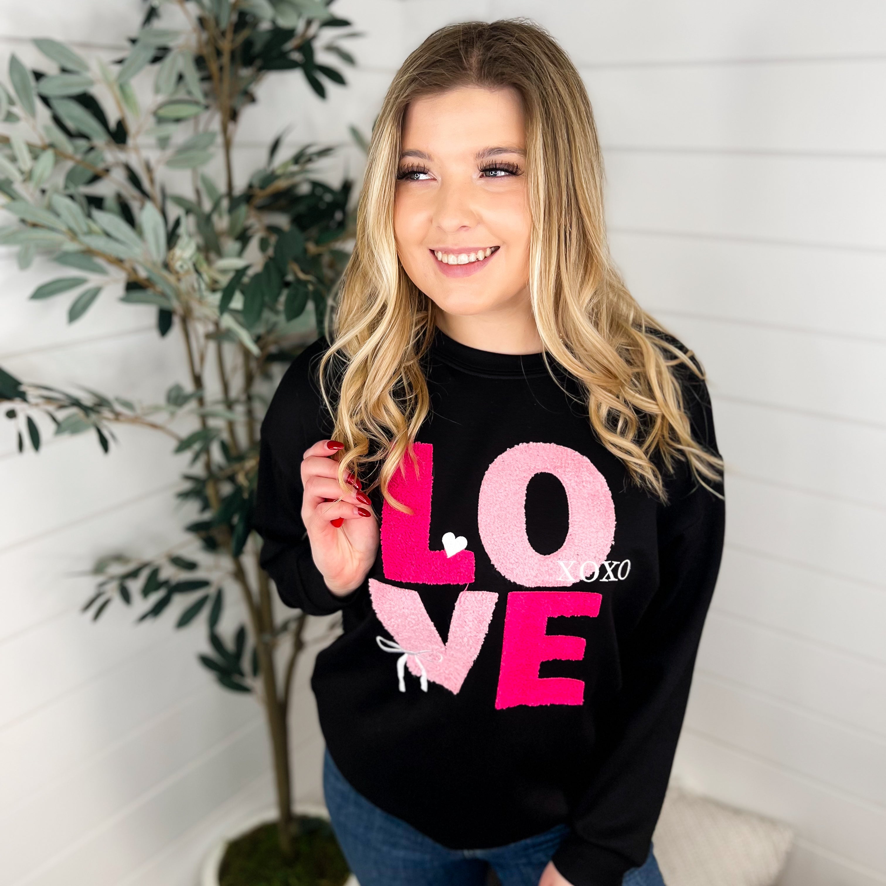 Celebrate every day like Valentine's Day with our Love Like That Rayon Blend Long Sleeve Black Avery Mae Top! Chenille letter patches spell out "Love" while an embroidered heart and bow add a touch of sweetness. This top is perfect for those who believe in the power of love.