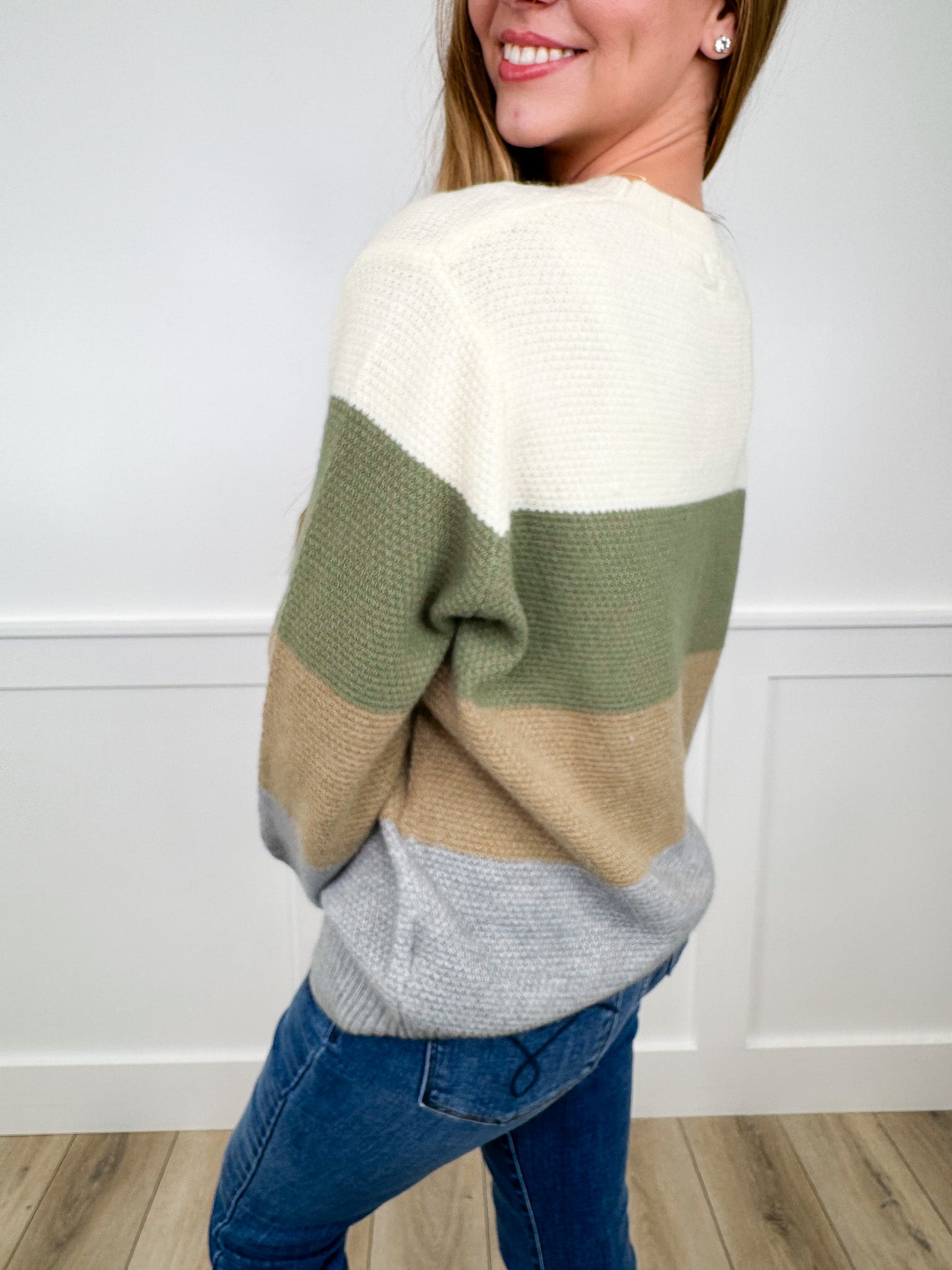 Cozy up in the Just Wanna Stay Knit Sweater Top, featuring a fun colorblock design in cream, olive, tan, and grey. Its textured knit and relaxed fit make it perfect for lounging or casual outings—comfortable enough to make you want to stay in all day!