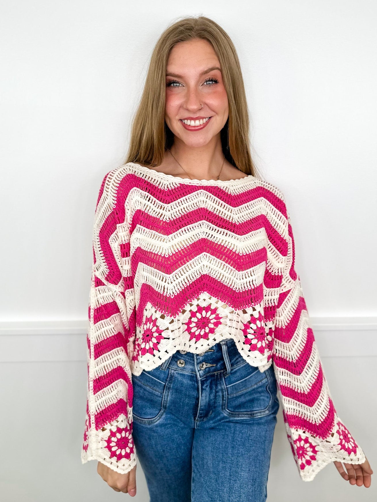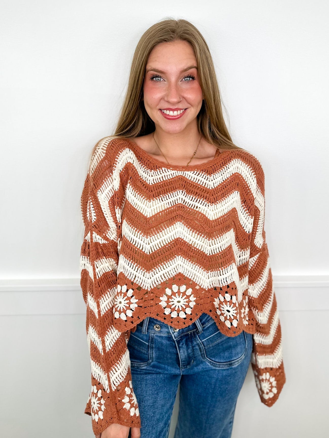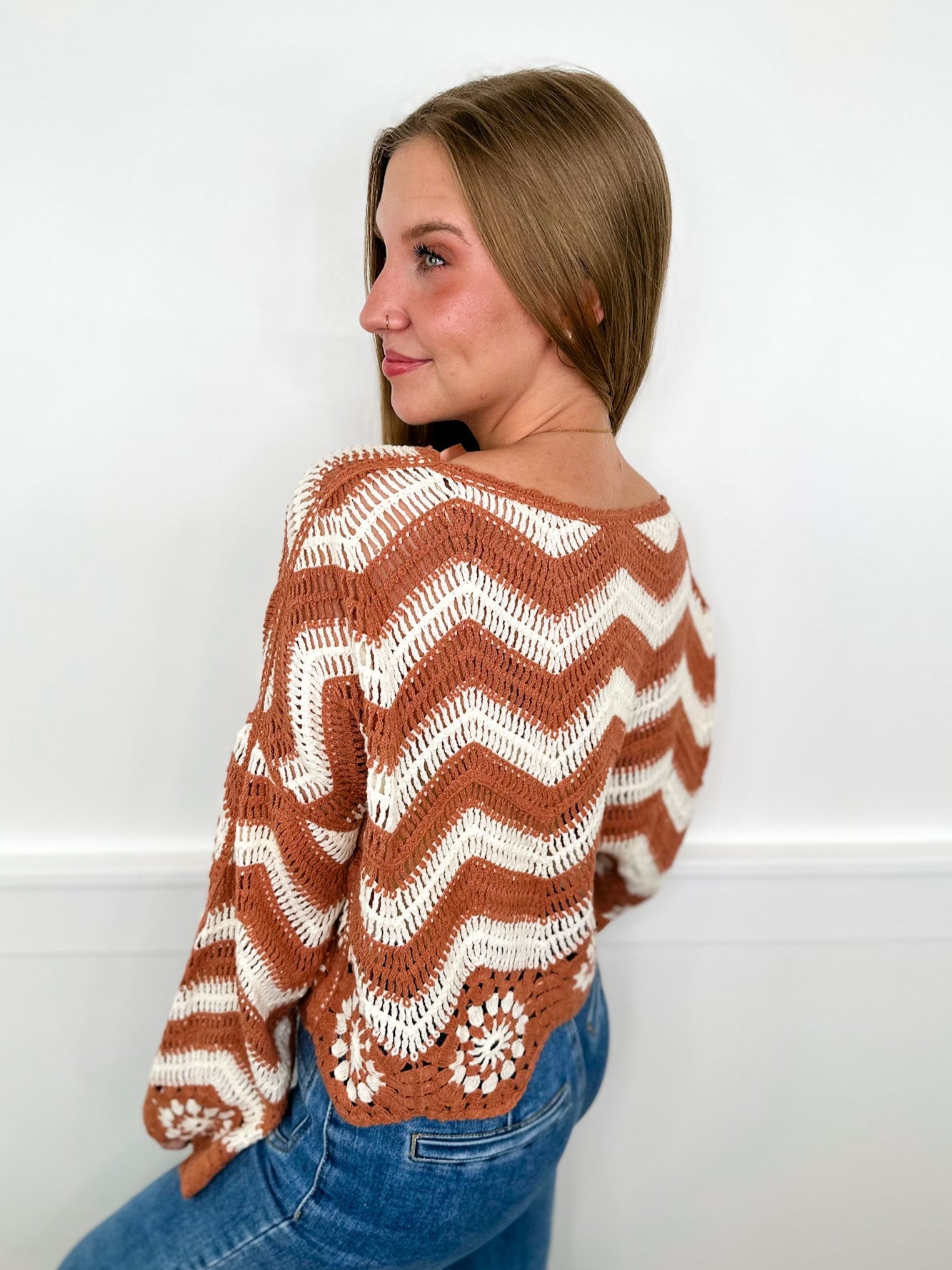 Cozy meets cute in this cropped sweater top, crafted from a soft cotton blend with a playful crochet chevron pattern. Perfect for layering, it adds a fun, textured twist to any outfit while keeping you comfy and stylish all day long. Available in two charming colors to brighten your wardrobe!