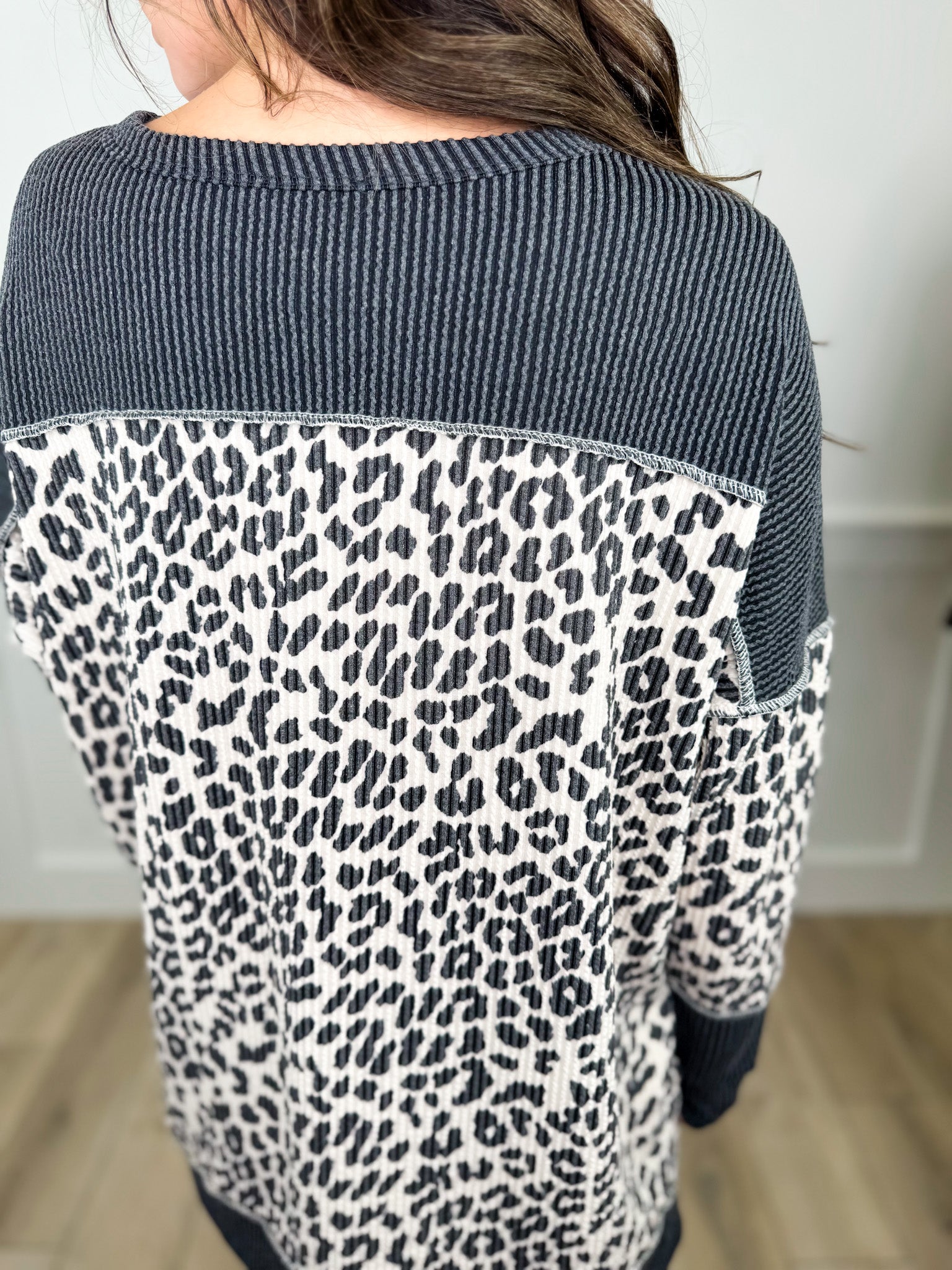 Embrace your wild side with this oversized ribbed long sleeve top featuring a striking leopard print in charcoal and cream. The oversized fit offers effortless comfort for layering or wearing solo, while classic button detailing adds a polished touch. Perfect for those days when you want to make a statement without trying too hard. A versatile piece that works as hard as you do.