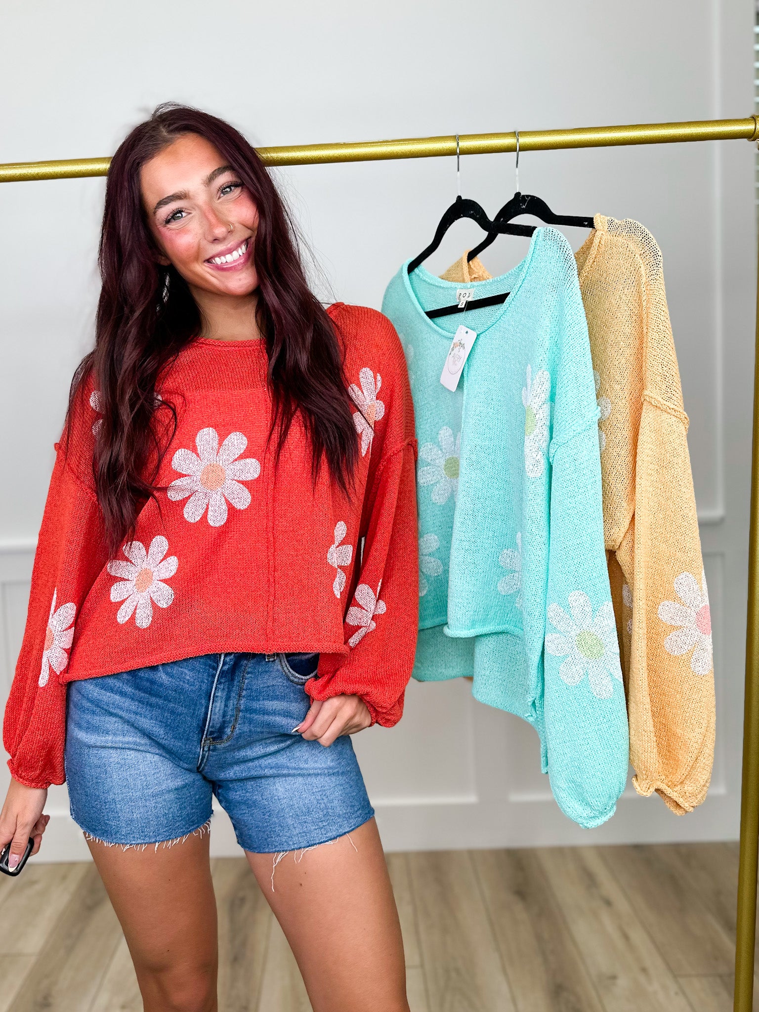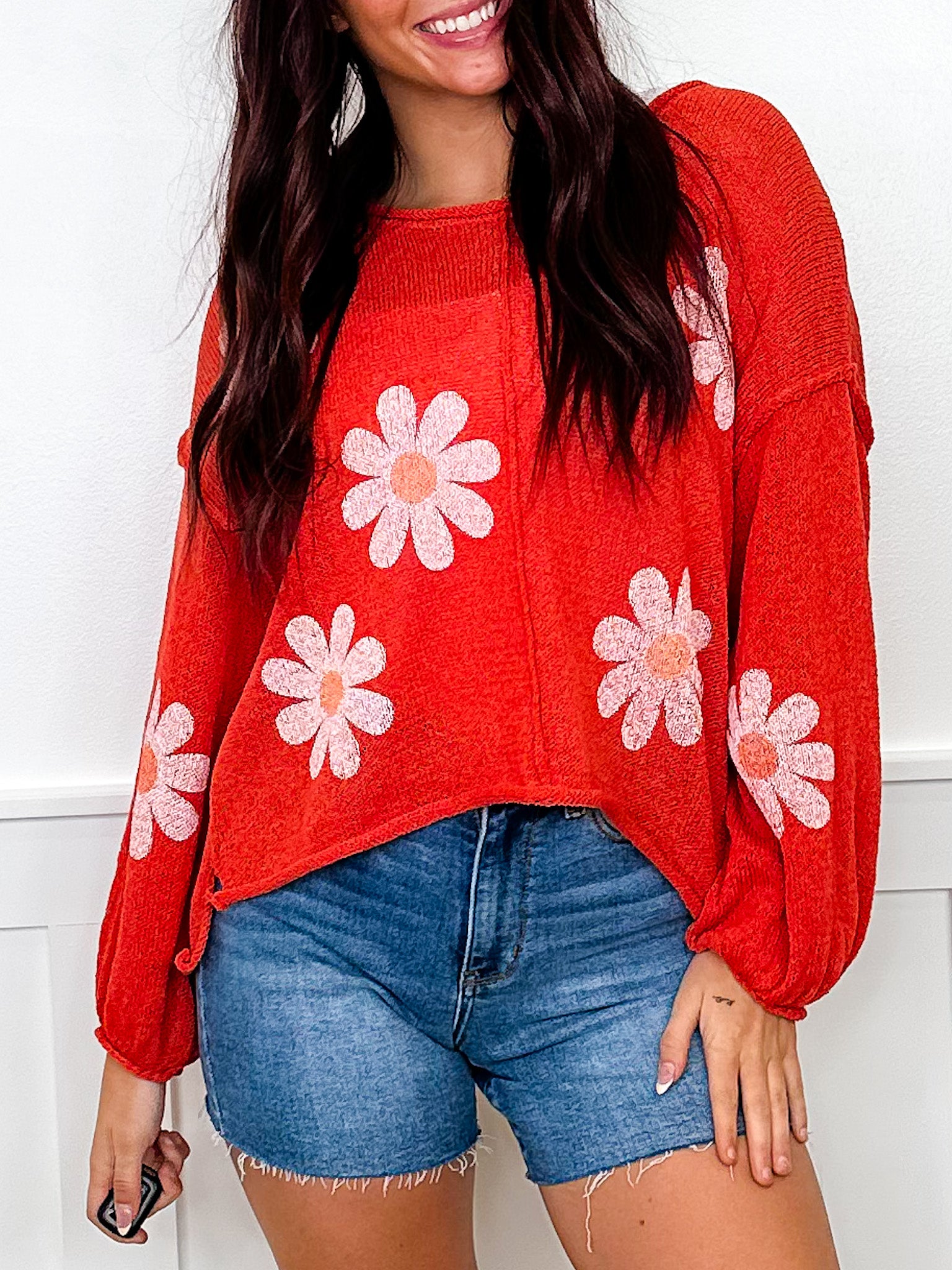 Meet your new favorite sweater top! This breezy open-knit design keeps things light and airy, while the eye-catching oversized daisy print adds instant charm to any outfit. Rolled hems give it that carefully curated, fashion-forward touch. Pick from three gorgeous colors to match your vibe—whether you're going for casual cool or weekend wanderlust. It's the kind of piece that makes getting dressed actually fun.