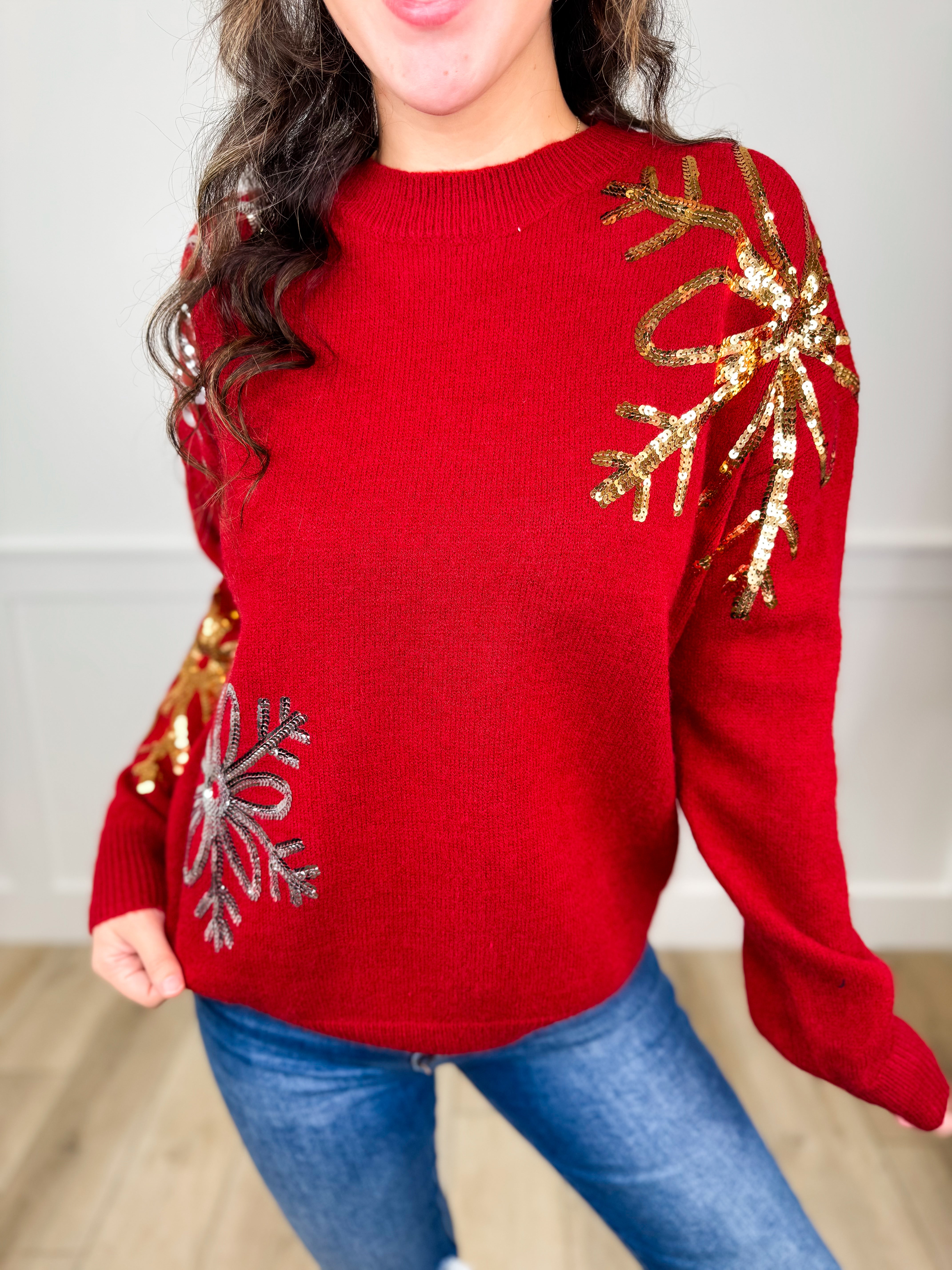 Bring sparkle to chilly days with the White Birch Winter's Glimmer Knit Sweater! Featuring a cozy round neck and shimmering gold and silver sequin snowflakes, this long sleeve top adds a festive glow to your winter wardrobe. Available in three charming colors, it’s perfect for brightening up cold weather with a playful gleam.