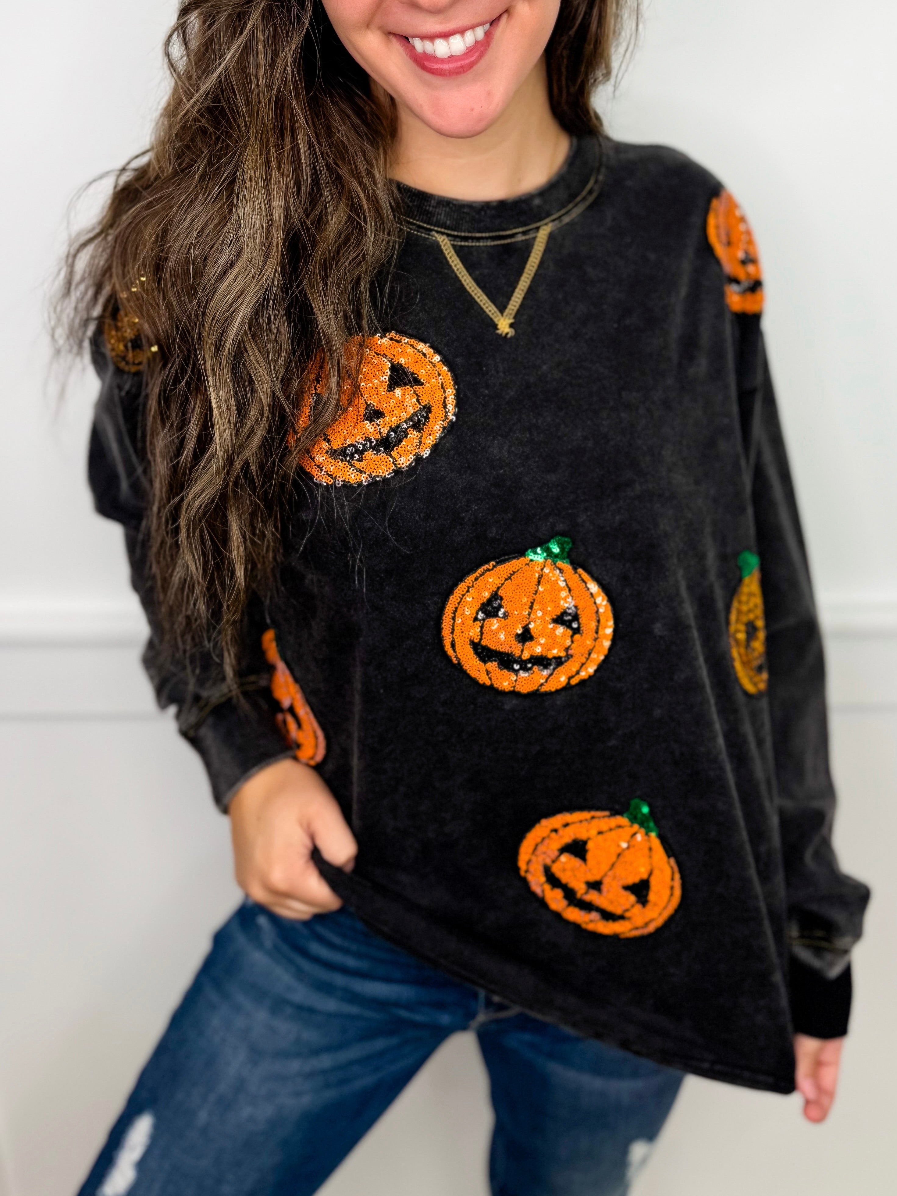 Be the Pumpkin Queen in style with our White Birch Charcoal top. Sequin jack-o-lanterns add a playful twist to this warm and cozy crewneck. Perfect for the spooky season!