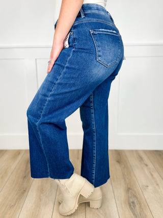 Risen Maeve Tummy Control High Rise Fray Hem Wide Leg Dark Wash Cropped Blue Jeans