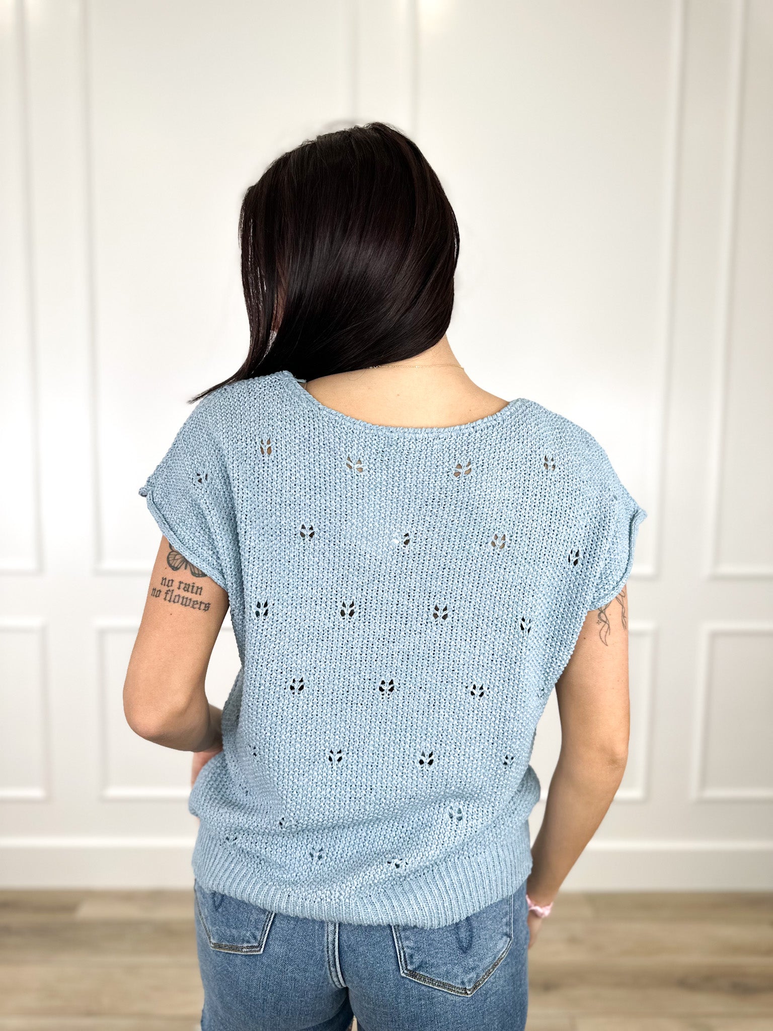 Elevate your essentials with a sweater top that feels as light as air. Featuring intricate pointelle stitching throughout, this short-sleeve knit offers a romantic, vintage-inspired texture. The wide crew neck adds a contemporary, feminine touch, making it the perfect piece for those days when you want to feel polished but stay completely comfortable.