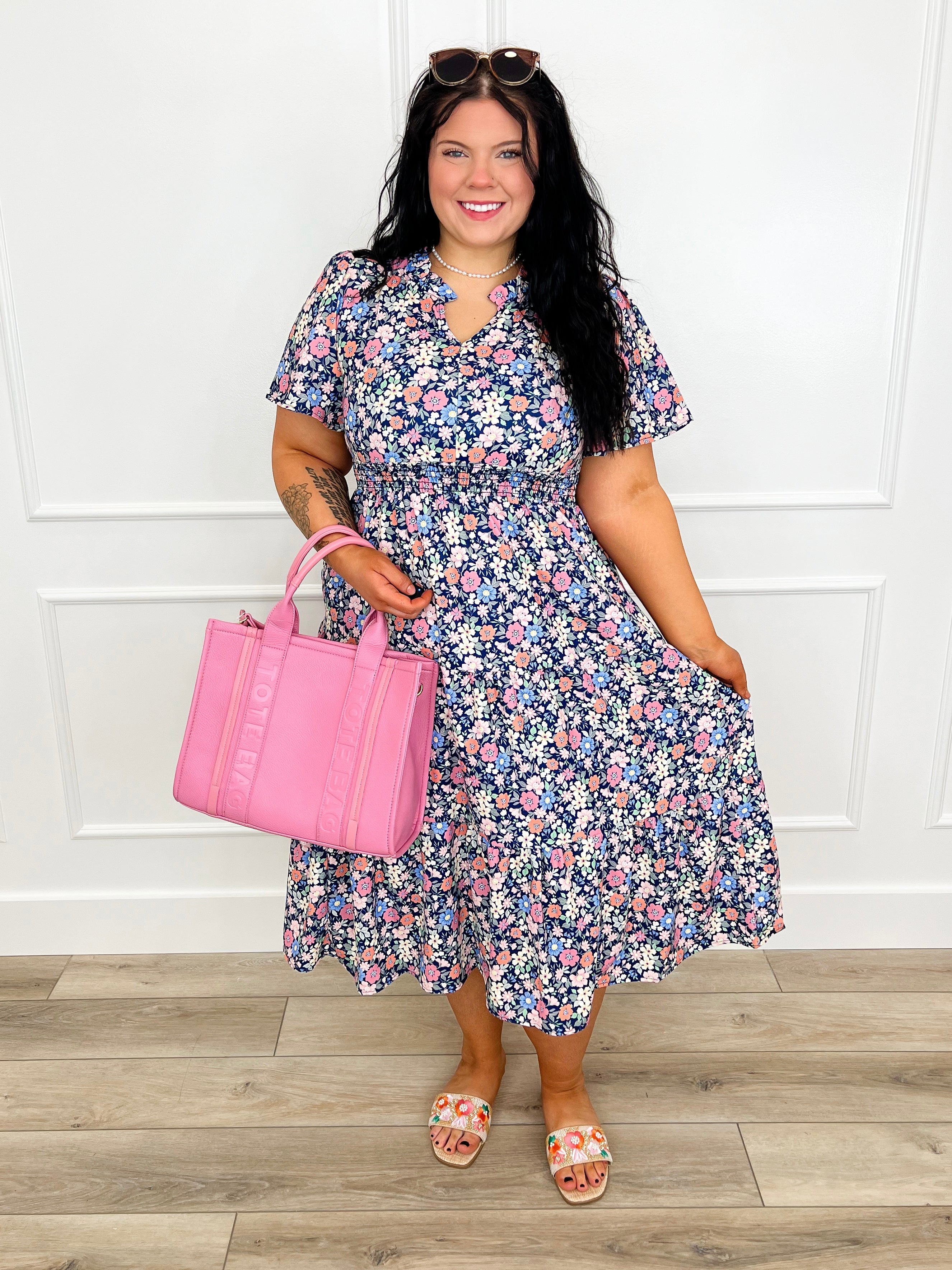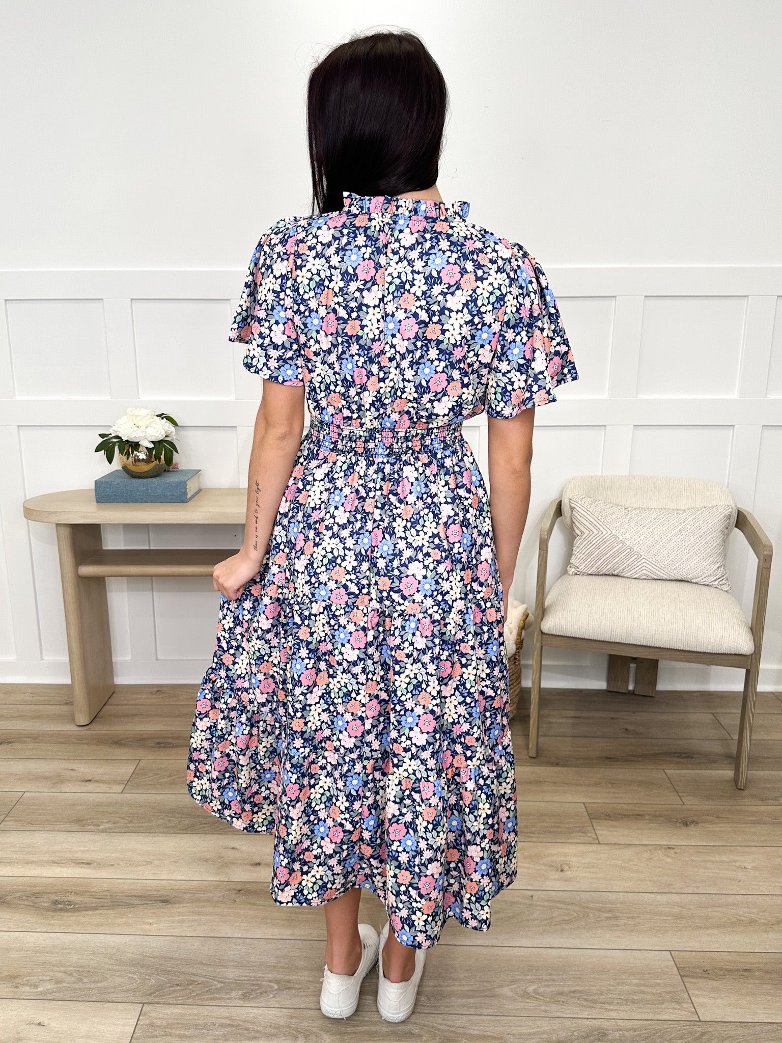 Elevate your wardrobe with this stunning navy blue maxi dress, featuring a vibrant multi-colored floral print that brings effortless charm to any occasion. The lightweight polyester fabric drapes beautifully with a smocked waist that creates a flattering silhouette, while the flare design adds movement and dimension. A delicate frill hem adds a feminine touch to the maxi length.
