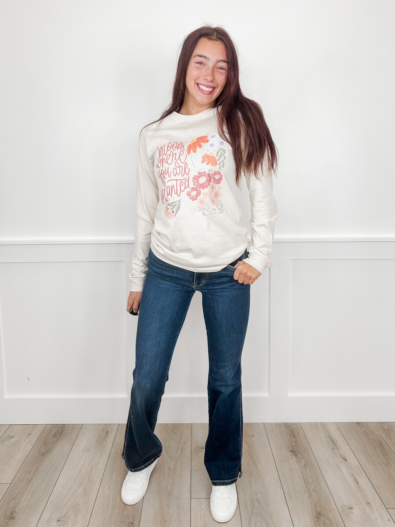 Embrace your roots with this charming long sleeve tee featuring a whimsical wildflower graphic that celebrates growth right where you are. Crafted from soft, breathable cotton, it's the perfect everyday piece that combines comfort with an uplifting message. Whether you're nurturing dreams or simply spreading positivity, this Avery Mae design reminds you to bloom beautifully, no matter the season.