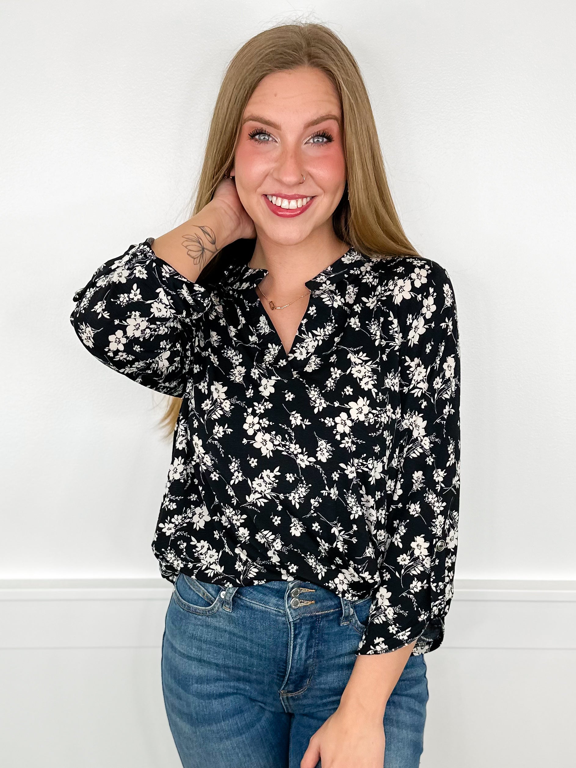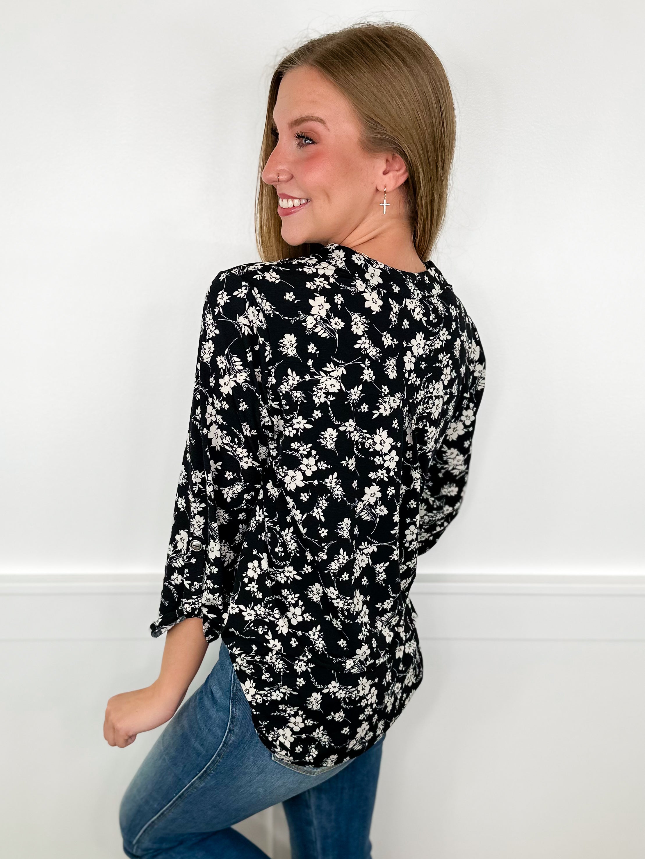 Brighten up your wardrobe with the Dear Scarlett Keep it Light Gabby Top. This playful black top features a charming cream floral pattern and comfortable 3/4 sleeves, perfect for adding a touch of effortless style. Its wrinkle-free fabric keeps you looking fresh all day, whether you're out for brunch or a casual night with friends.