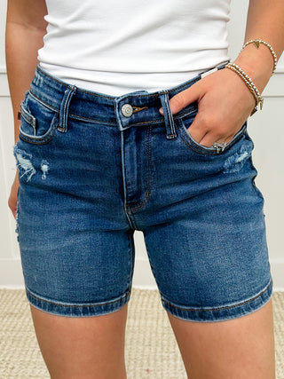 Risen Lainey Distressed High Rise Fray Hem Dark Wash Blue Shorts
