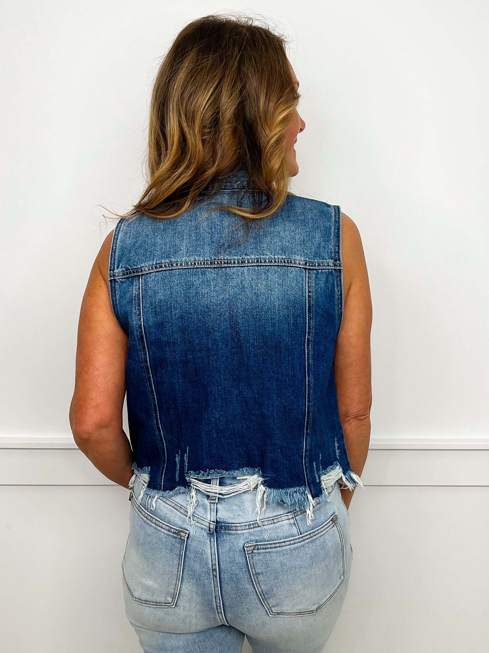 Rock your rebellious side with our Risen Aly Denim Vest! This playfully edgy piece boasts a moody dark wash with pop-worthy contrast details. The distressed cotton fabric tells everyone you're too cool for the rules, while easy button-up styling keeps your options wide open.