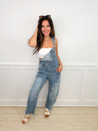 Jaedyn Rigid Distressed Fray Hem Barrel Leg Medium Wash Overalls