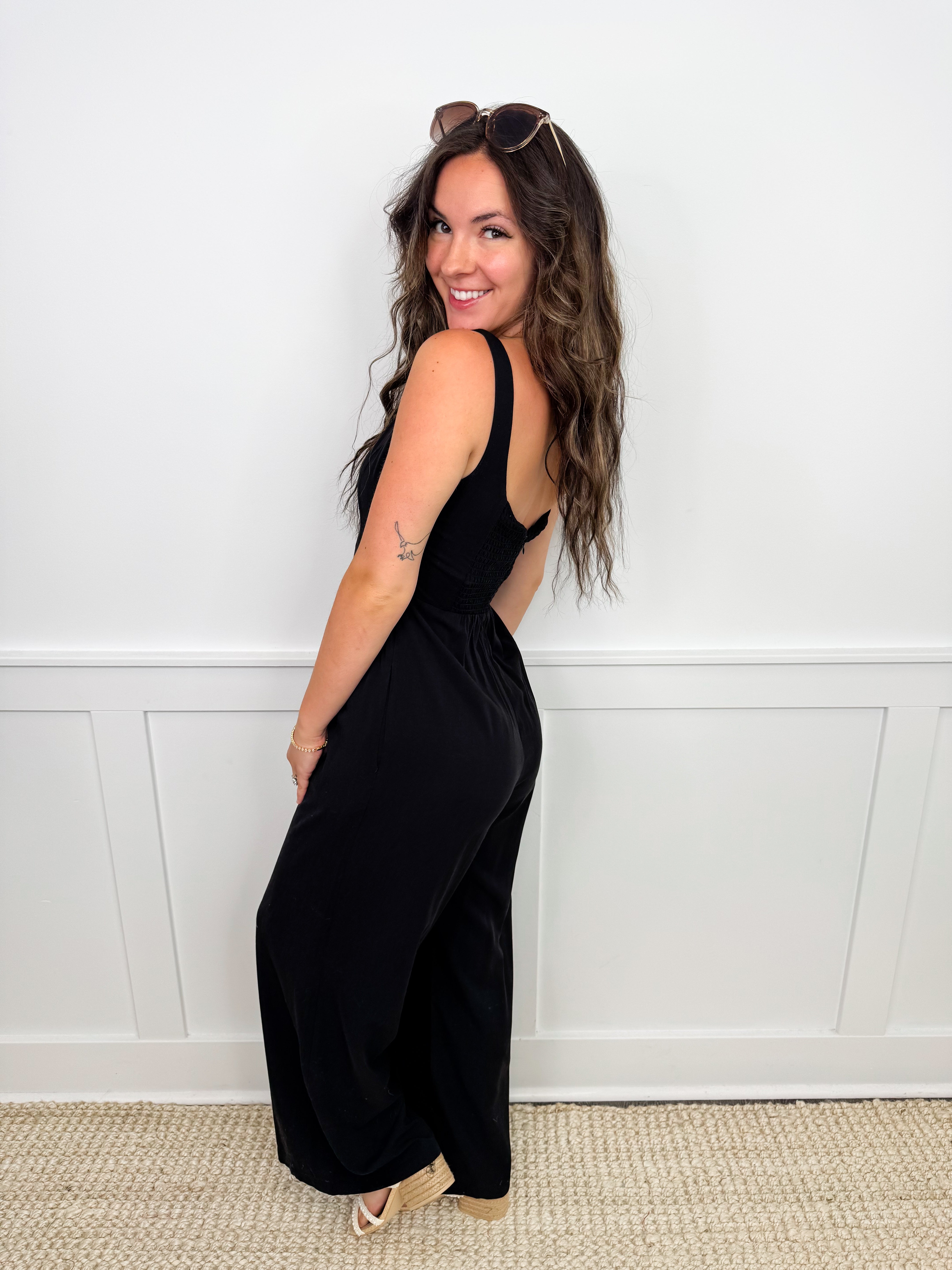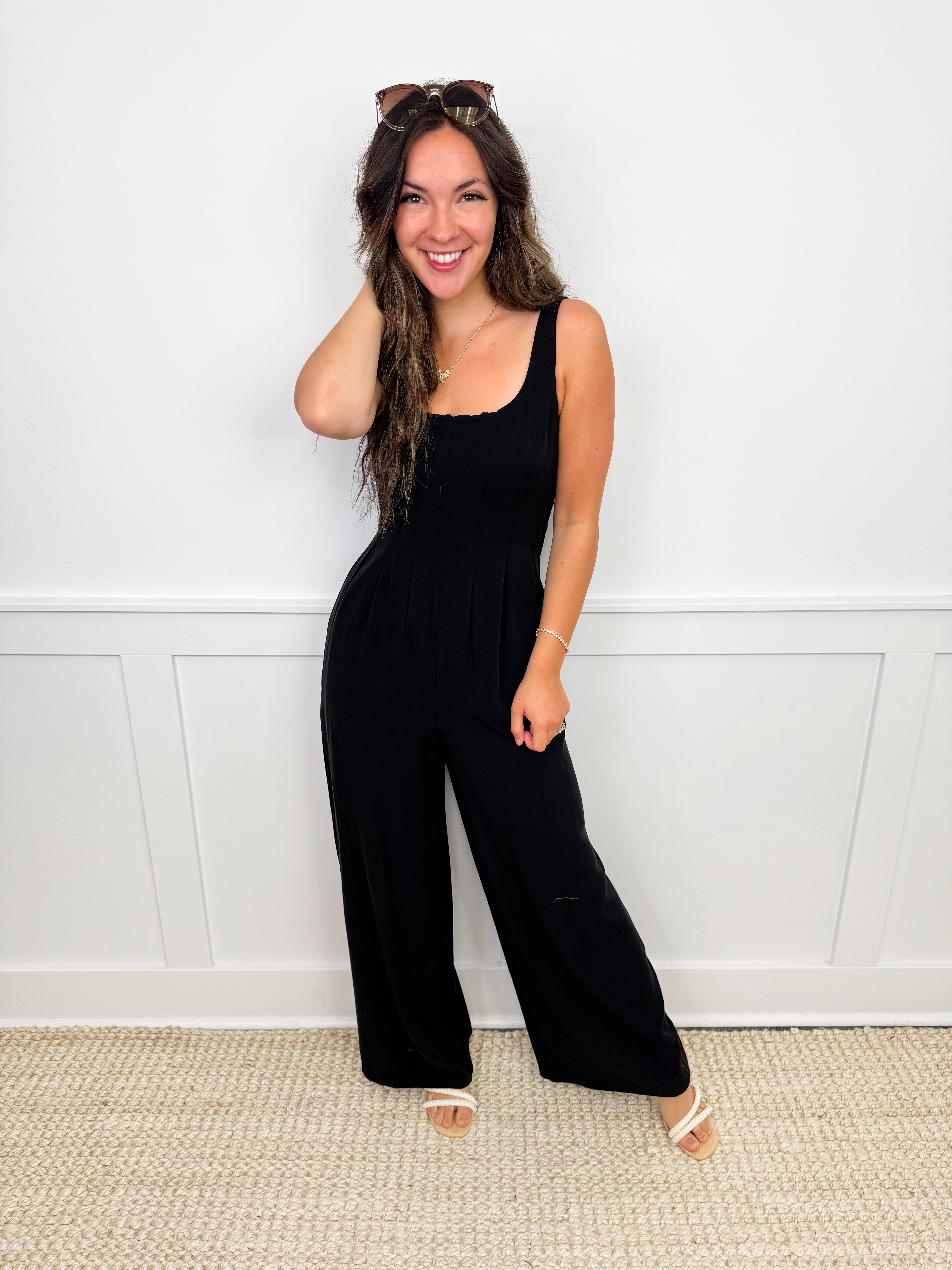 This Summer Beauty Rayon Blend Black Avery Mae Black Jumpsuit features charming smocking in the back, adding a playful touch and extra stretch for a comfy, flattering fit. Perfect for dancing through your day with ease and style!
