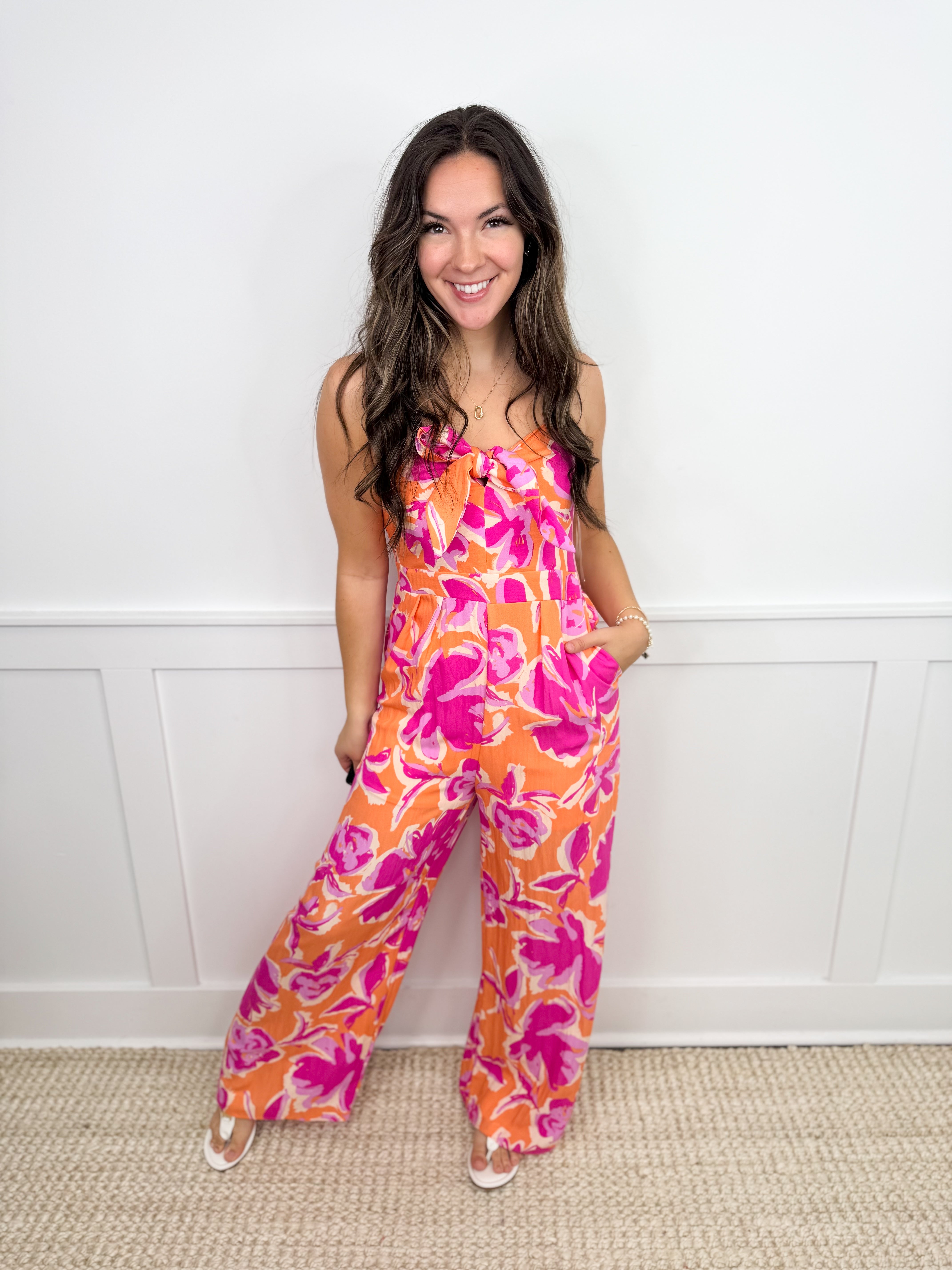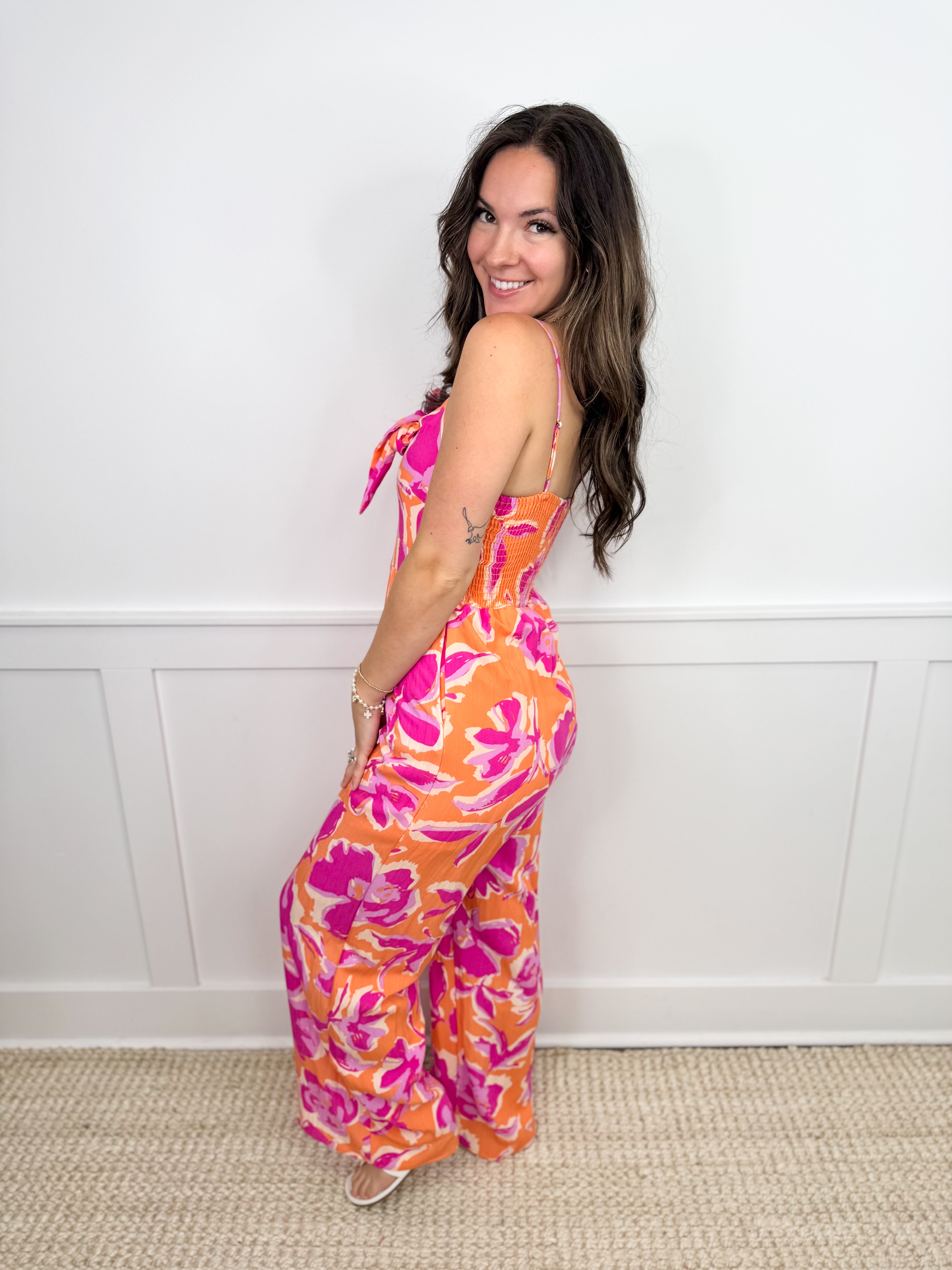 This playful jumpsuit features a vibrant floral print in warm sunset hues, crafted from a soft rayon blend for all-day comfort. The front tie detail adds a flirty touch, while the wide-leg silhouette offers effortless movement and a breezy feel. Perfect for sunny days and casual outings, it brings a cheerful pop of color to your wardrobe.