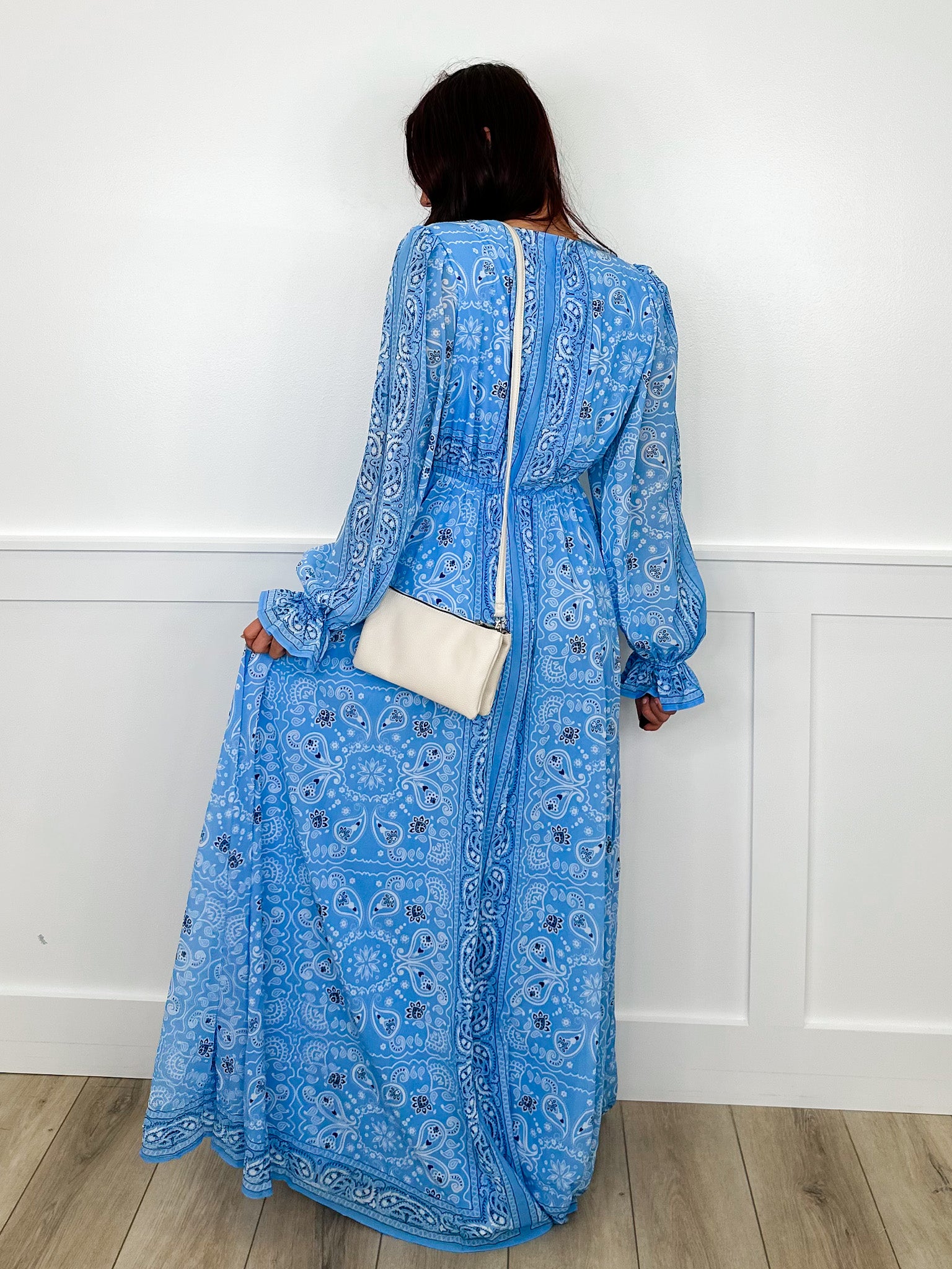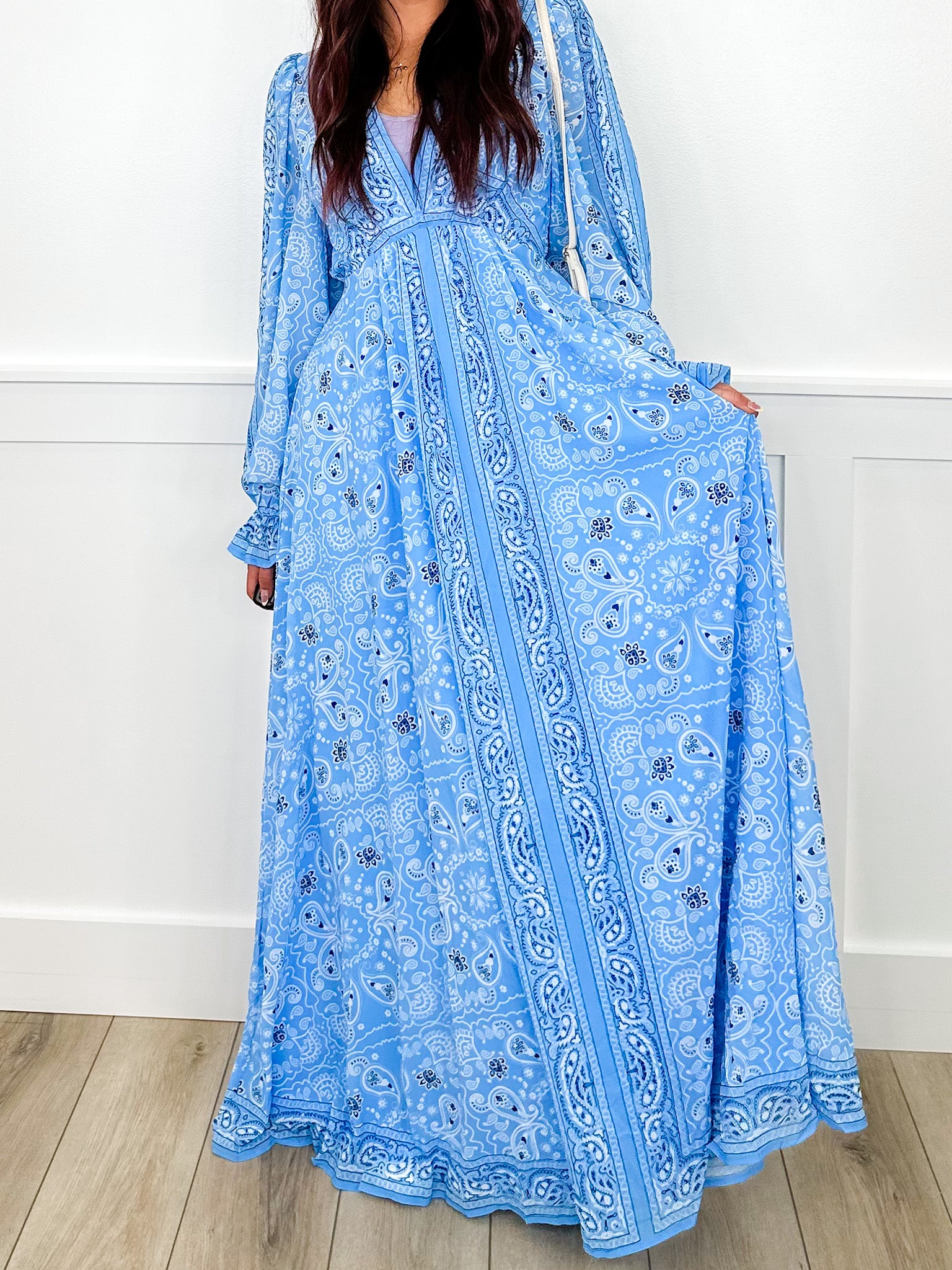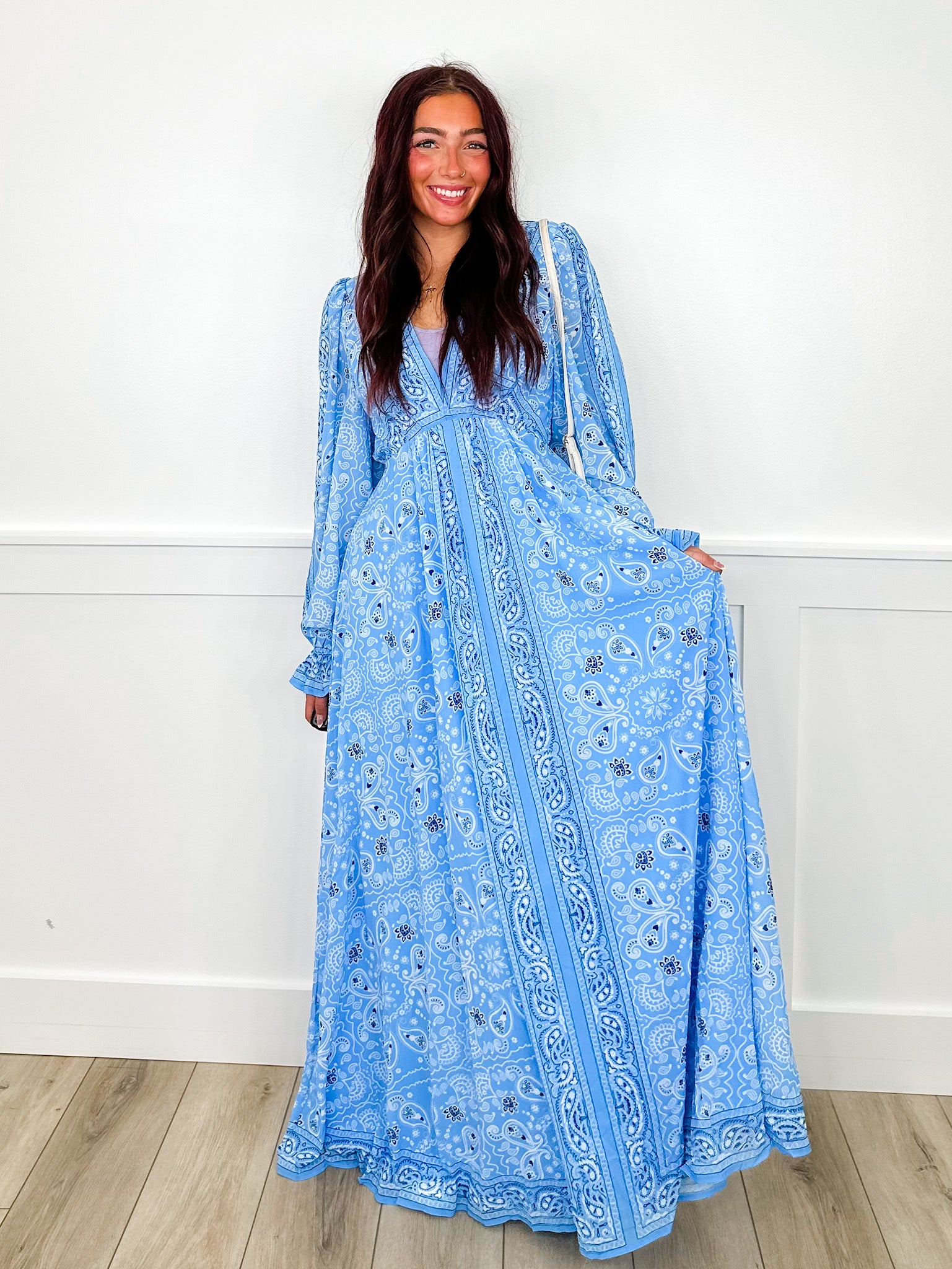 Twirl through your days in this enchanting blue paisley maxi dress that feels like wearing a cloud. The flowing fabric moves with you, creating effortless elegance whether you're heading to brunch or a sunset adventure. Lightweight and breathable, it's the perfect companion for warm-weather wandering. With its dreamy paisley print and graceful silhouette, this dress transforms any moment into something magical. Slip it on and let the good vibes follow.