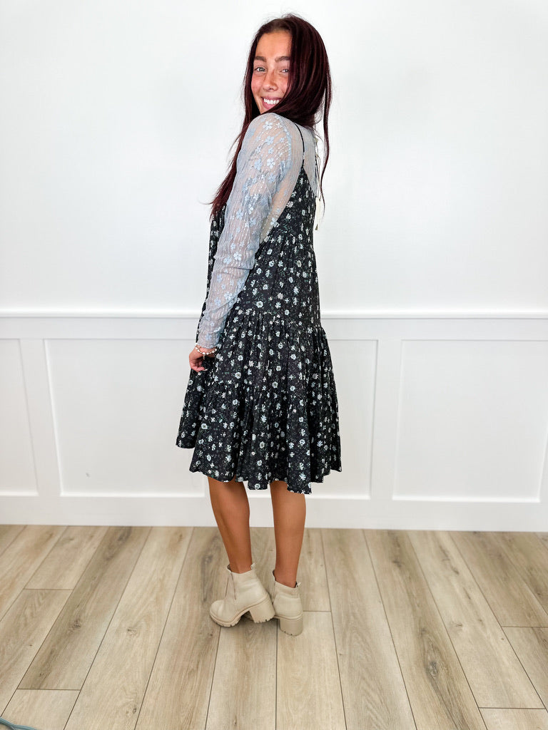 Twirl into effortless style with this lightweight black dress featuring delicate blue floral designs. Perfect as a layering piece under jackets or cardigans, or wear it solo as a breezy cover-up. The airy fabric moves with you, making it ideal for warm days when you want something easy and versatile. Dress it up or down—this charming piece adapts to whatever your day calls for.