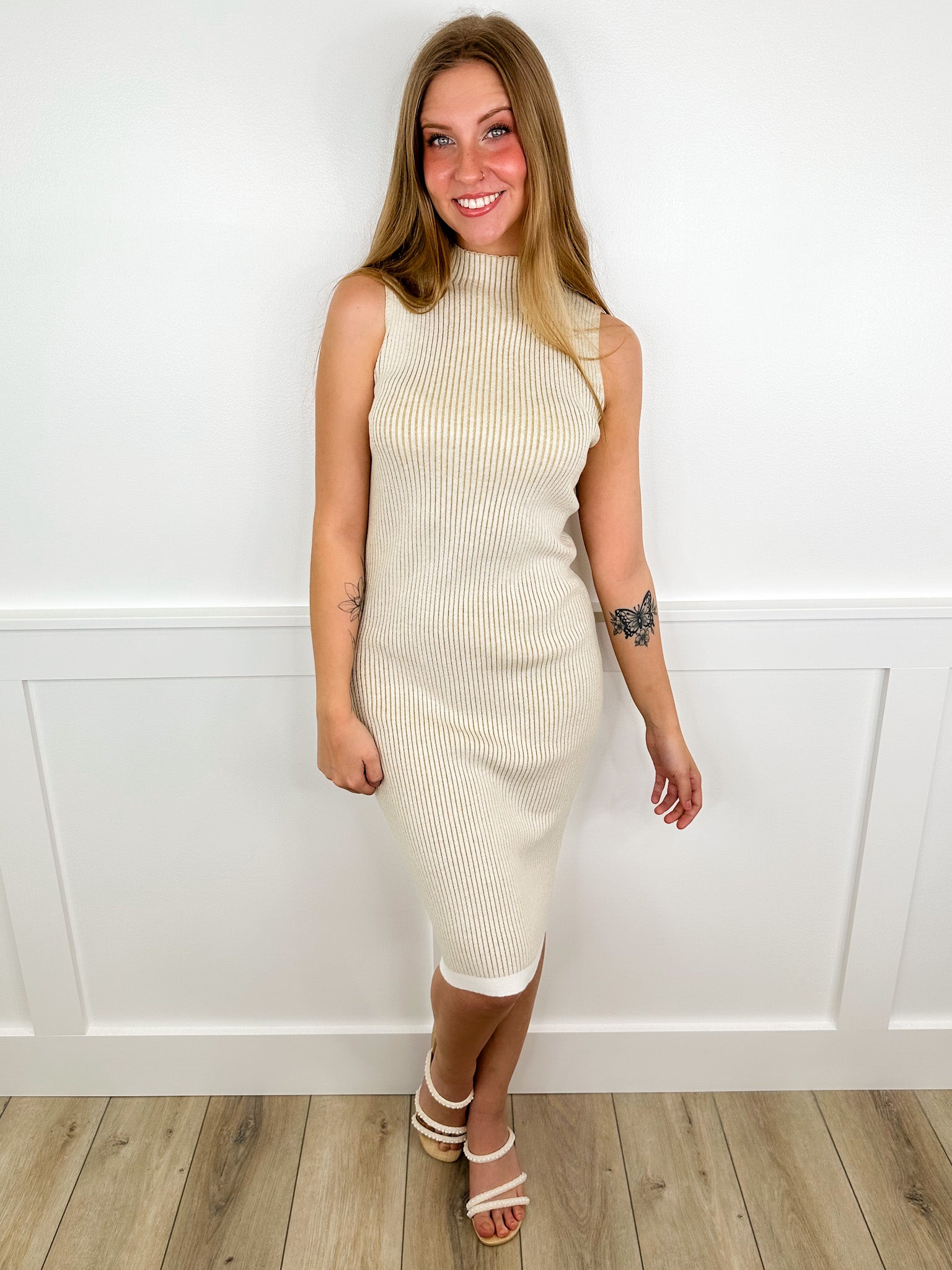 Step into effortless charm with the Elevated Looks Ribbed Oatmeal Avery Mae Dress. This playful, sleeveless dress features a cozy mock neck and a textured ribbed design that adds a fun twist to your everyday look. Perfect for mixing and matching, it brings warmth and style to any occasion.