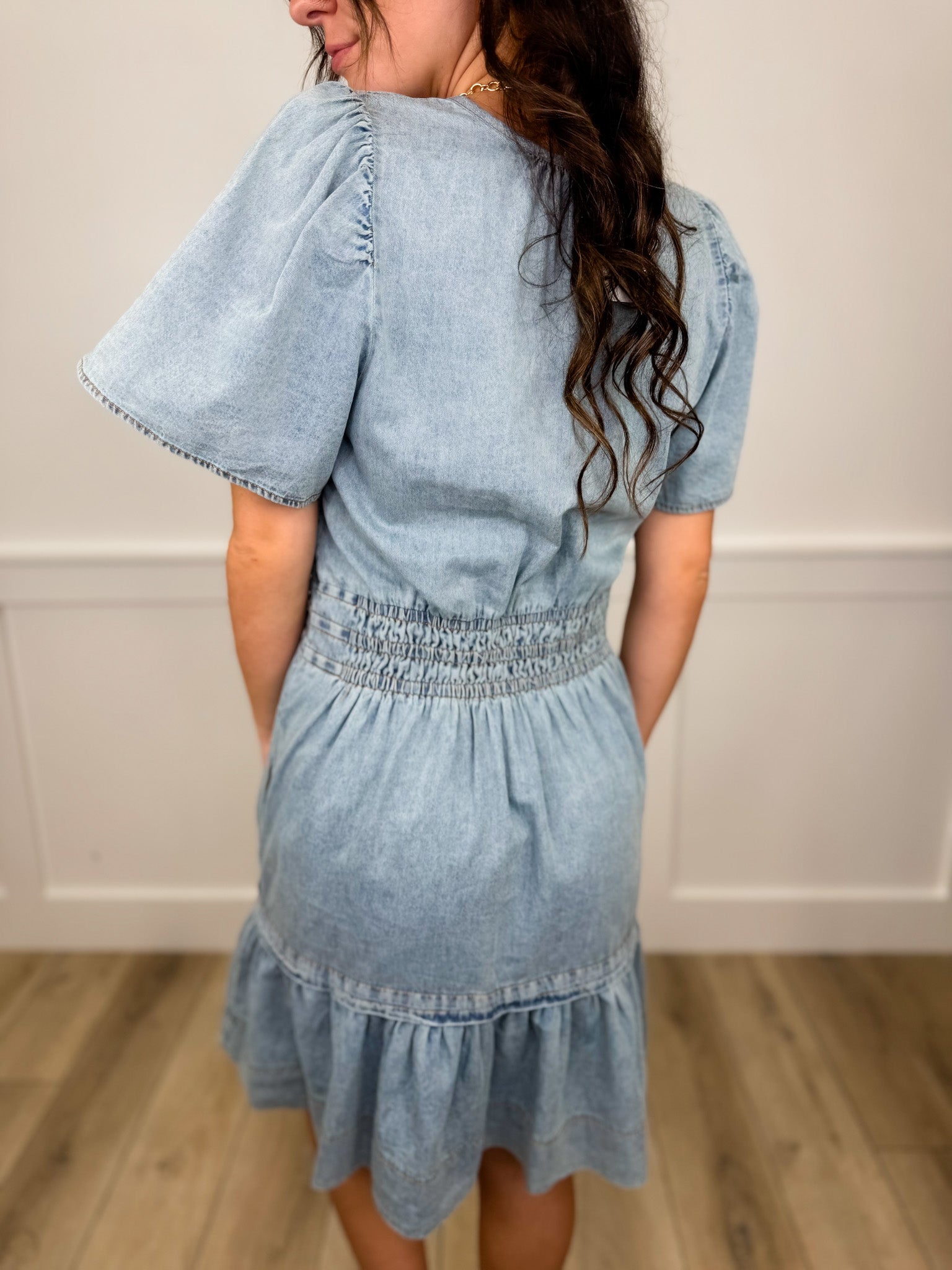 Embrace effortless charm with this medium wash denim mini dress featuring playful puff sleeves and flattering smocking detail. Perfect for sunny days or casual nights out, its light, fun design lets you radiate confidence with every step.