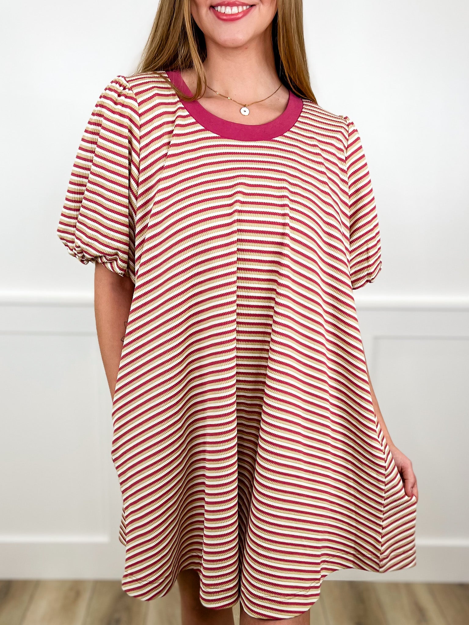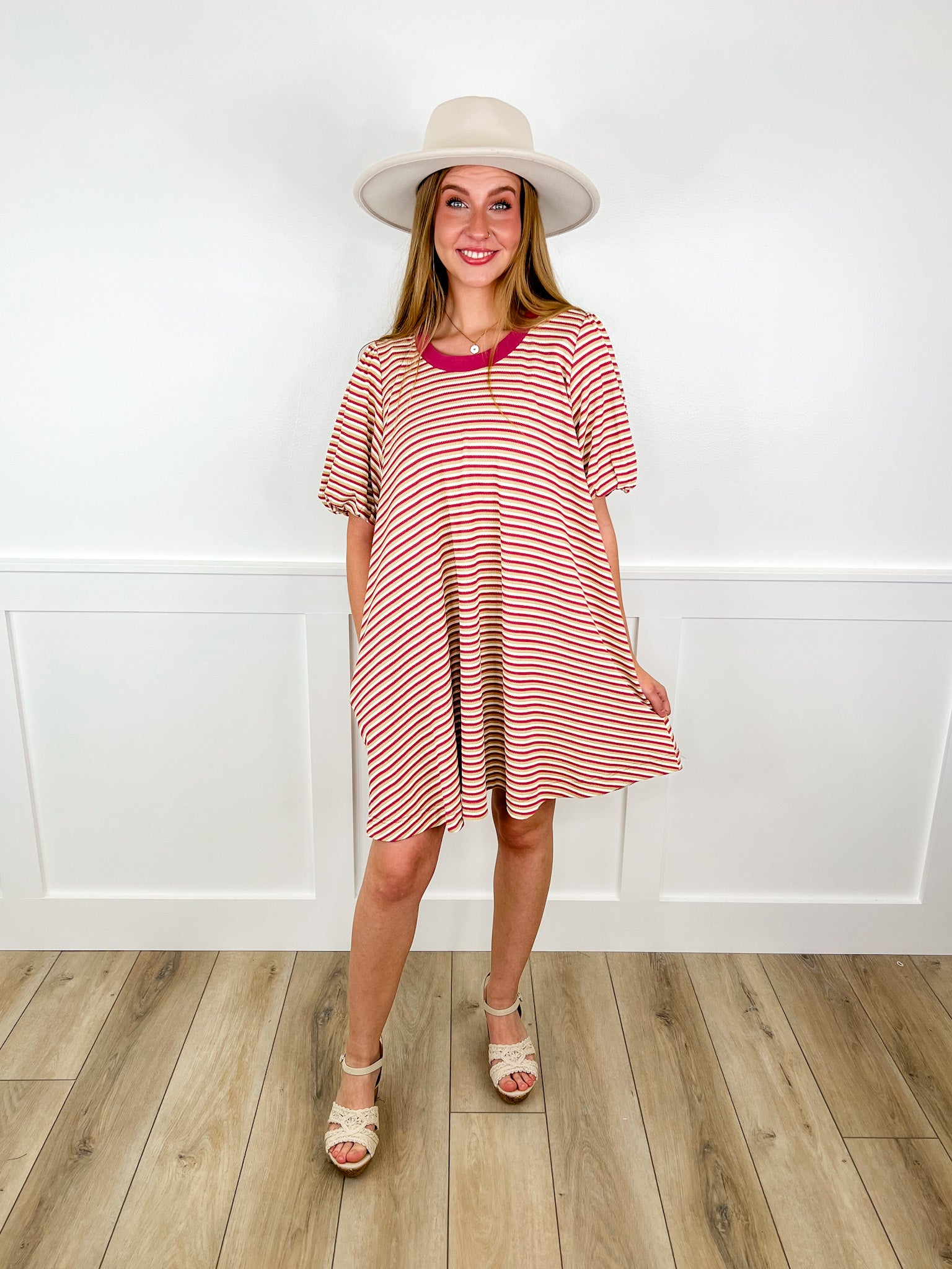 Add a splash of fun to your wardrobe with the Stop & Celebrate Lightweight Striped Avery Mae Dress. Featuring vibrant rose pink, tan, and cream stripes, playful bubble sleeves, and convenient pockets, this dress is perfect for twirling through sunny days with style and ease.