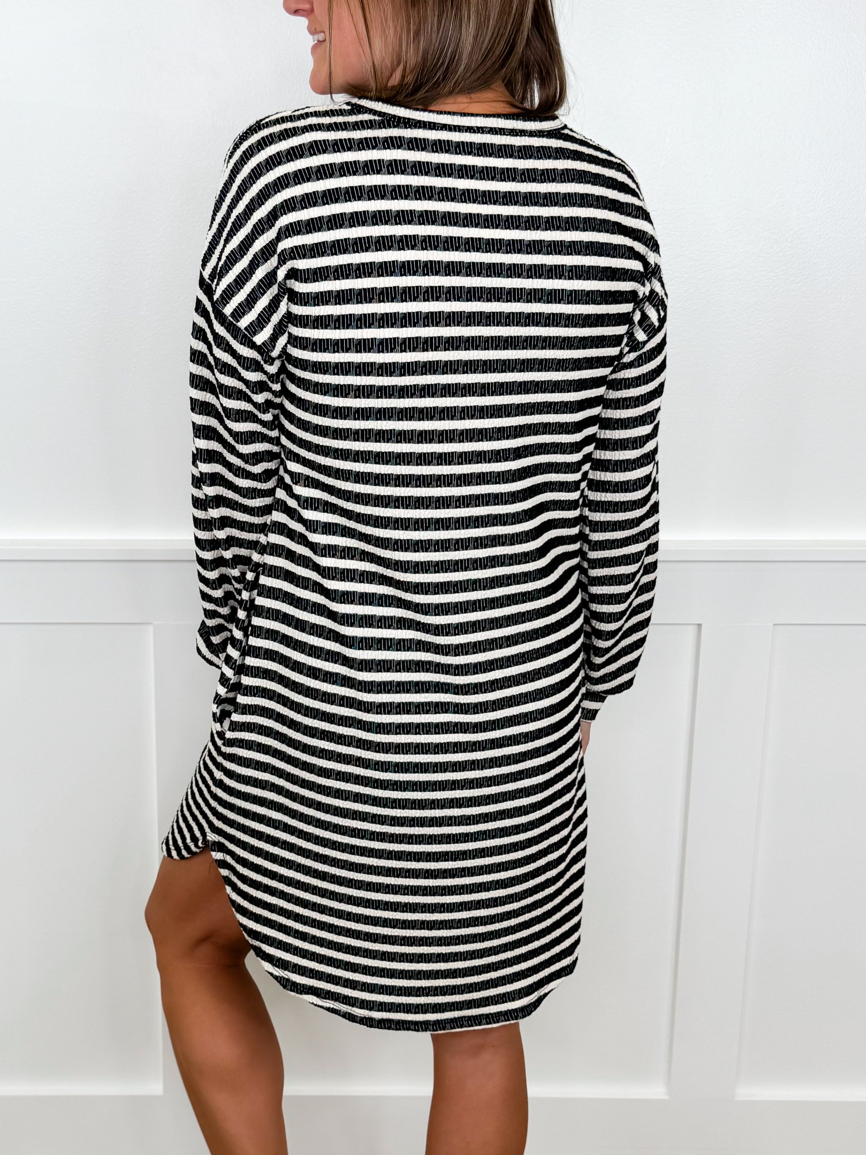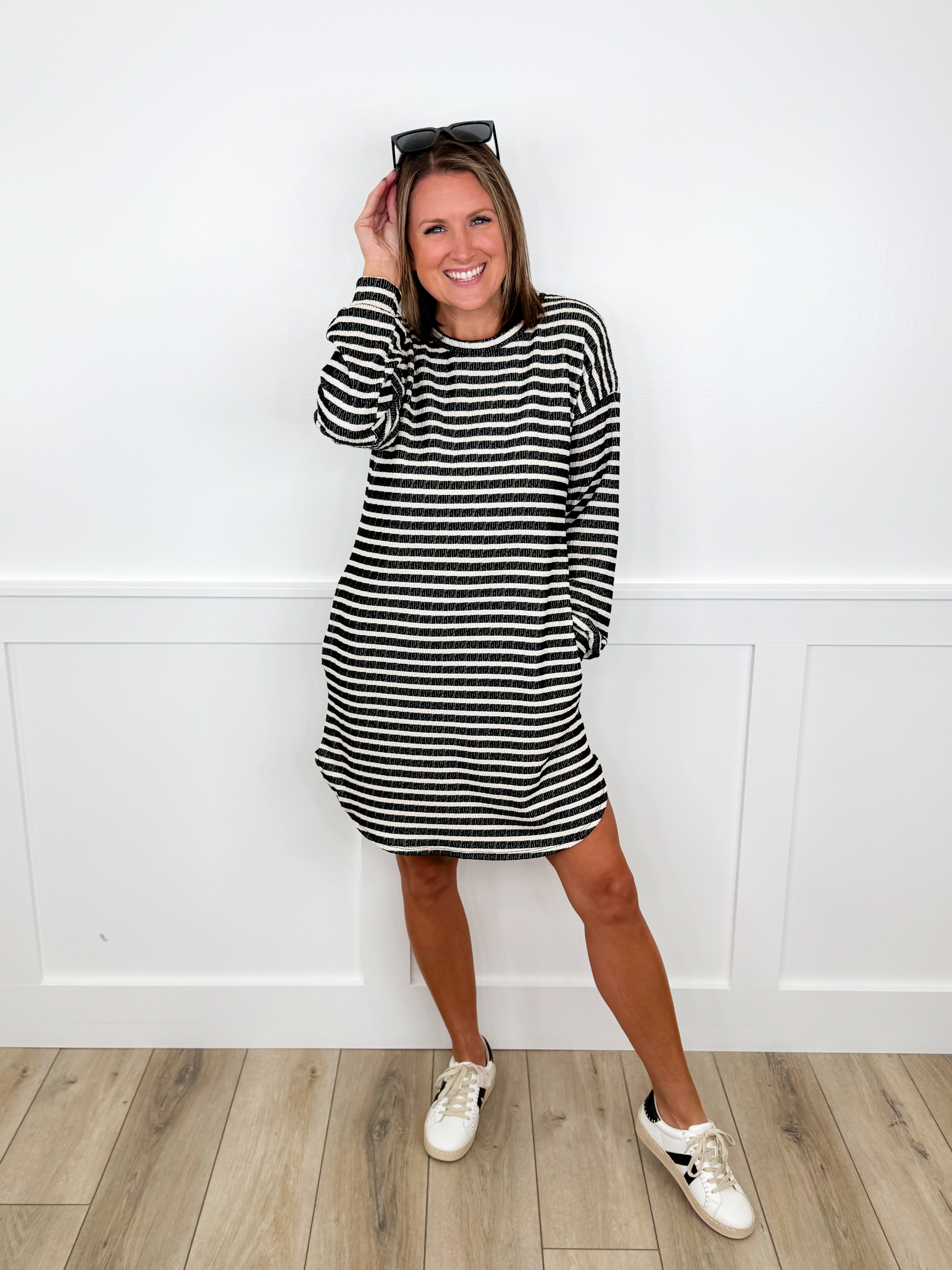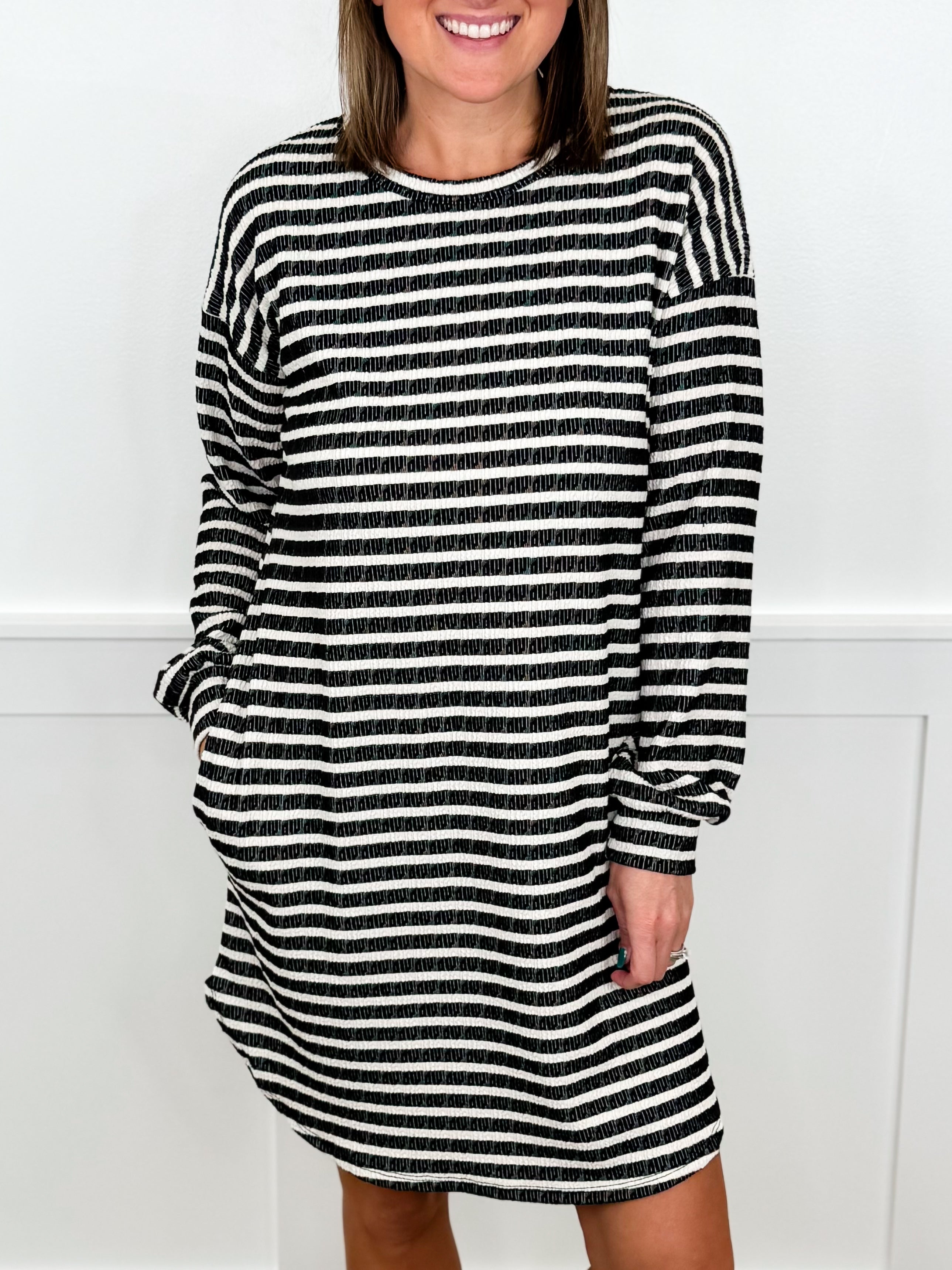 Elevate your look with the Treat You Better Ribbed Black Avery Mae Dress. This daring piece features bold stripes, long sleeves, and convenient pockets, combining edgy style with practical comfort. Perfect for making a statement while keeping essentials close at hand.