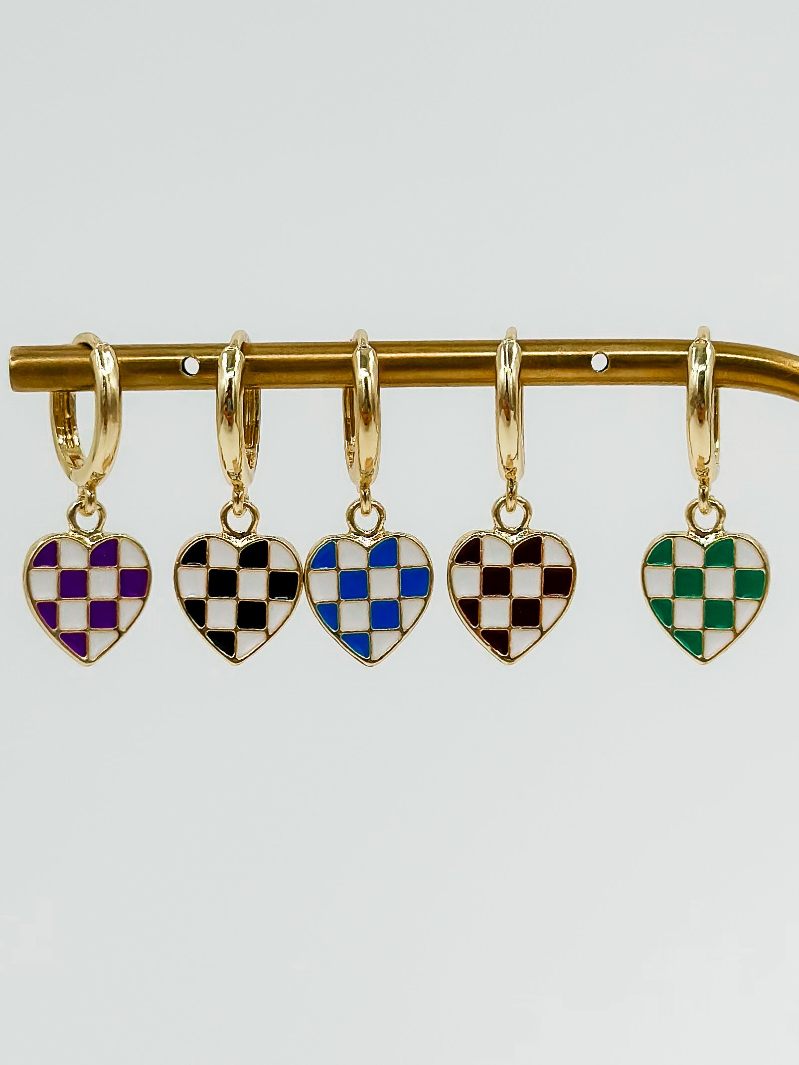 Upgrade your earring game with our A Trendy Kind of Love Drop Earrings! These gold huggie hoops feature a trendy checkered heart drop in your choice of 4 colors: purple, black, green, or blue. Make a statement and add some love to your look.