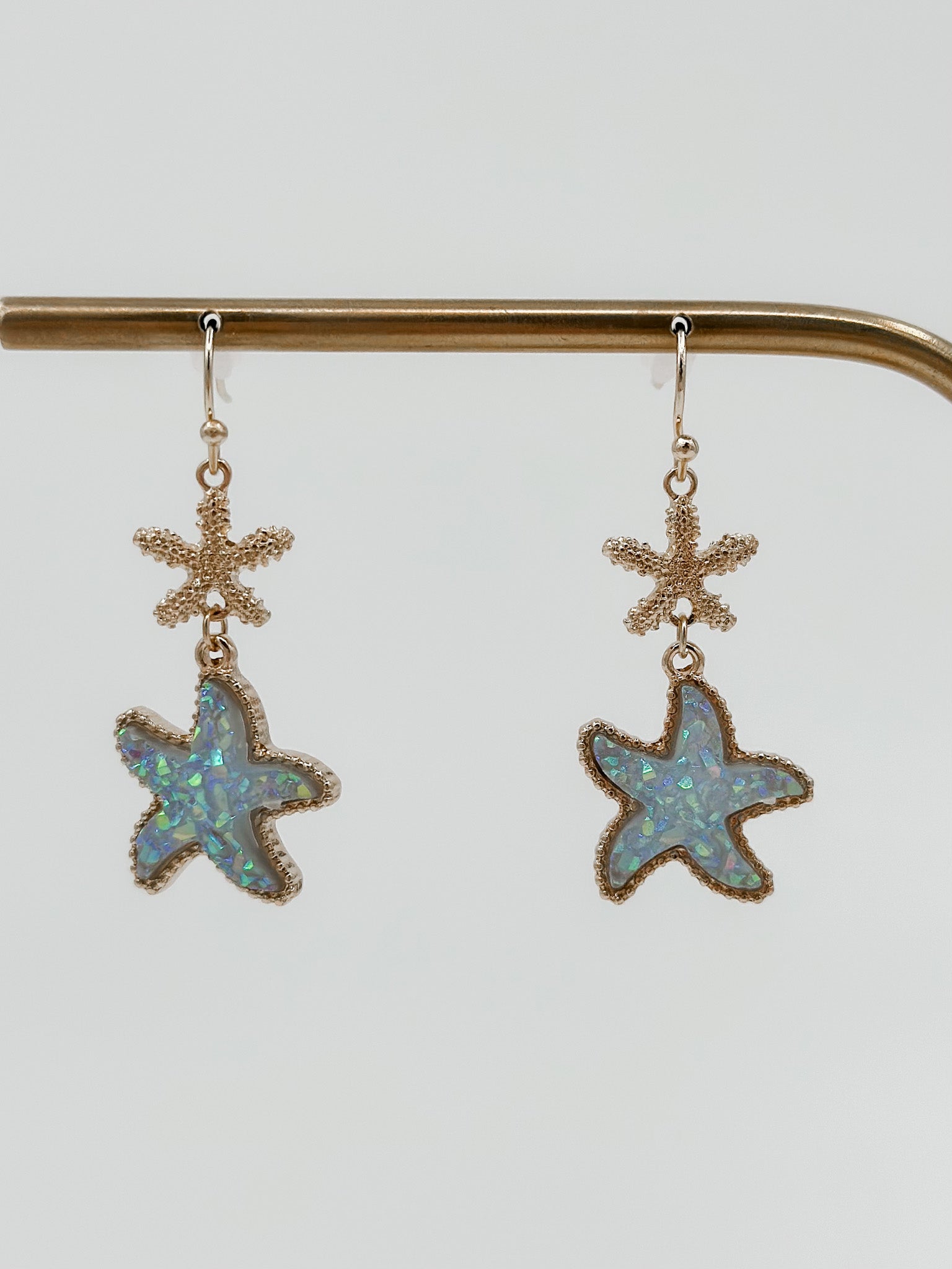 Dive into whimsy with these enchanting Deep Sea Gold Dangle Earrings, featuring shimmering blue druzy starfish that catch the light with every turn of your head. Each starfish sparkles with natural mineral magic, suspended from delicate gold findings that add a touch of coastal elegance. Perfect for ocean lovers and jewelry enthusiasts who crave a conversation starter, these playful dangles bring a splash of seaside charm to any outfit. Whether you're heading to the beach or just dreaming of sandy shores, let these little starfish guide your style.