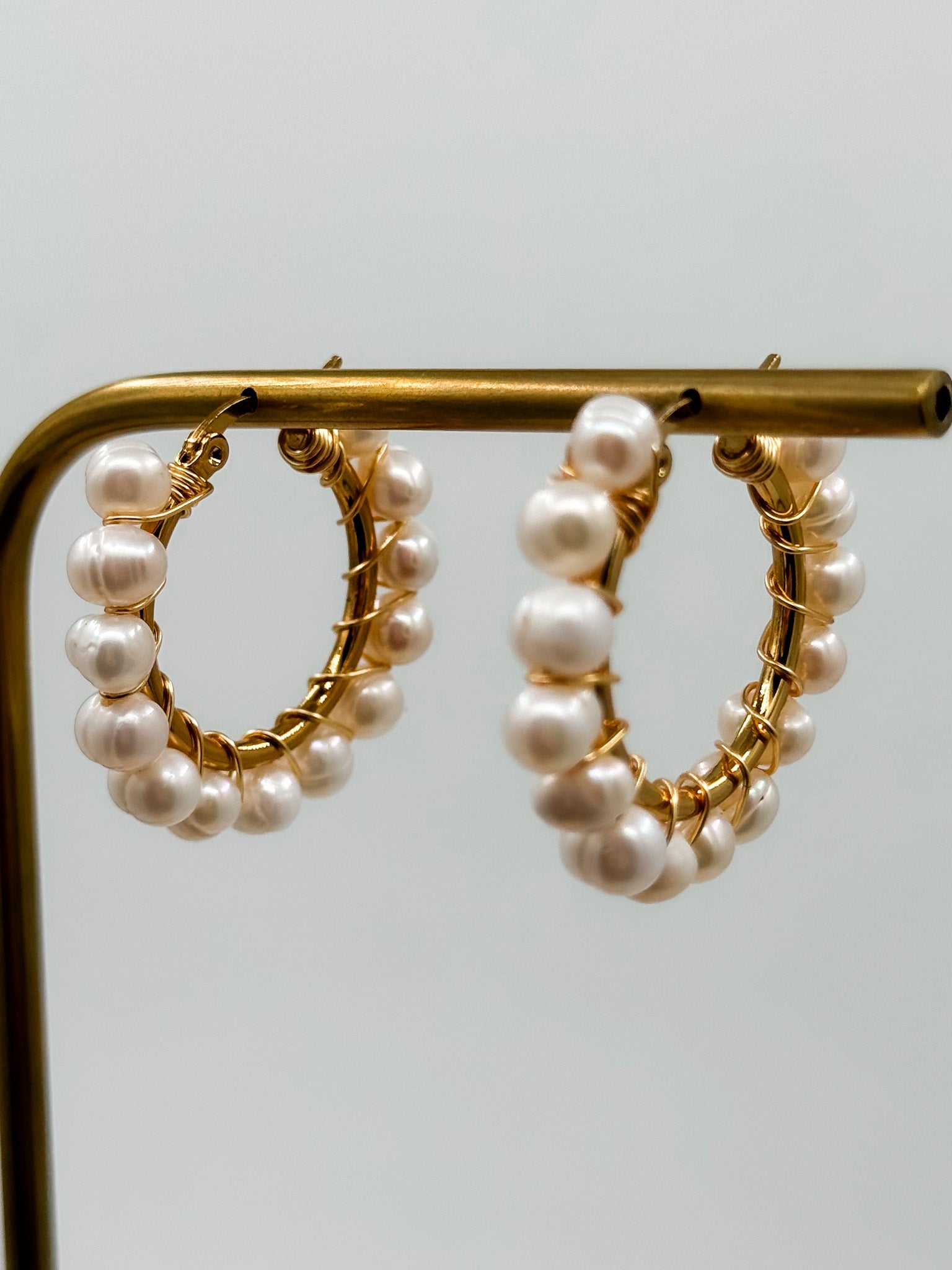 These hoop earrings will add a touch of elegance to any outfit with their freshwater pearls and gold accents. Perfect for a night out or to elevate your everyday look. They're the ultimate pearl pop for any stylish, playful gal!
