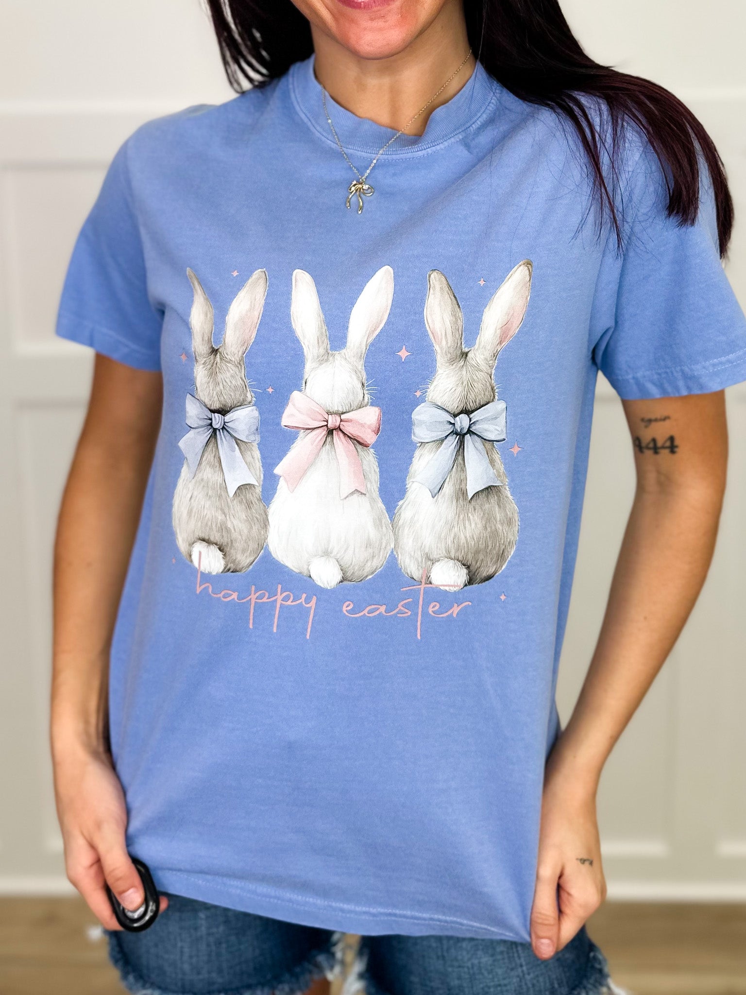 Hop into the season with this charming Easter Wishes tee featuring three adorable bunnies sporting festive bows. The vintage wash gives it that perfectly lived-in feel, while the soft cotton keeps you comfortable all day long. Whether you're celebrating the holiday or just spreading springtime cheer, this playful graphic tee is your go-to pick for casual style with personality.