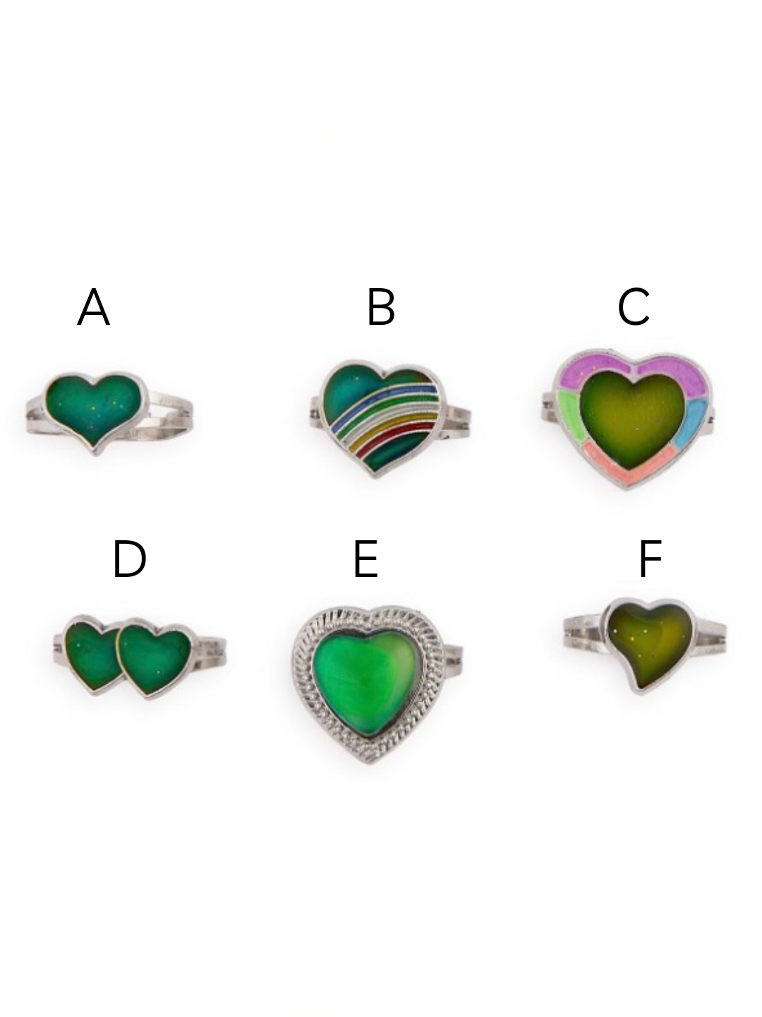 Discover your emotional vibe with this charming heart-shaped mood ring that shifts colors to match your feelings. Each piece is wonderfully unique, making it a one-of-a-kind accessory that's as individual as you are. The adjustable band ensures a perfect fit for any finger, while the playful design adds a touch of whimsy to your everyday style. Whether you're curious about what your mood says or just love the nostalgic fun factor, this heart mood ring is the perfect way to wear your emotions on your sleeve—literally!