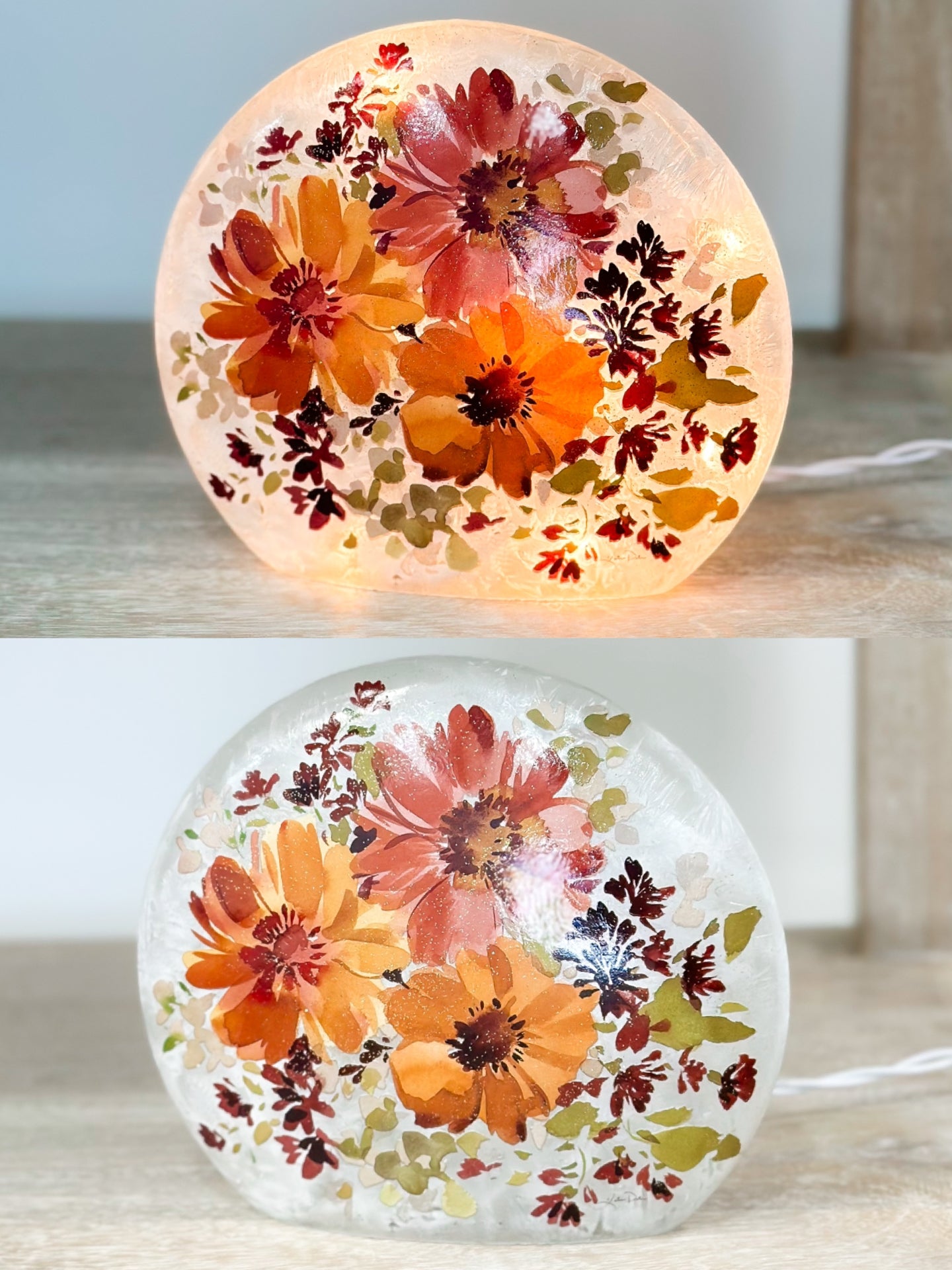 Brighten your space with the Path of Flowers Light Up Shelf Decor! This charming piece features delicate fall florals glowing softly through frosted glass, creating a cozy, inviting atmosphere. Plug it in to add a playful touch of warmth and whimsy to any room. Perfect for adding a splash of seasonal cheer with a gentle, luminous glow.