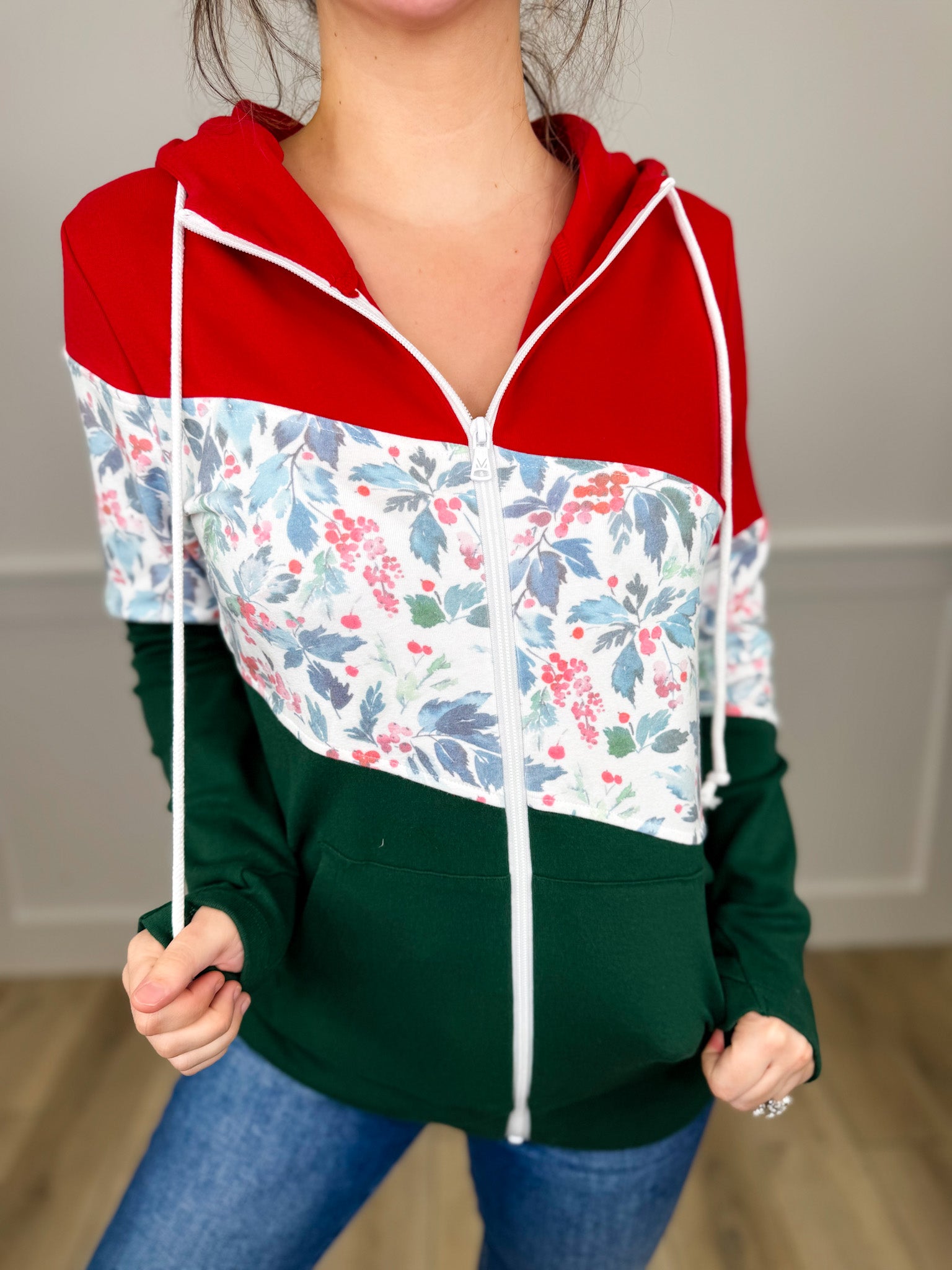 Wrap yourself in cozy comfort with this playful colorblock hoodie that's as fun as it is functional. Featuring a vibrant mix of red, green, and winterberry print, this long sleeve full zip sweatshirt brings seasonal cheer to your everyday wardrobe. The soft cotton blend keeps you warm and snug, while practical pockets let you stash your essentials in style.