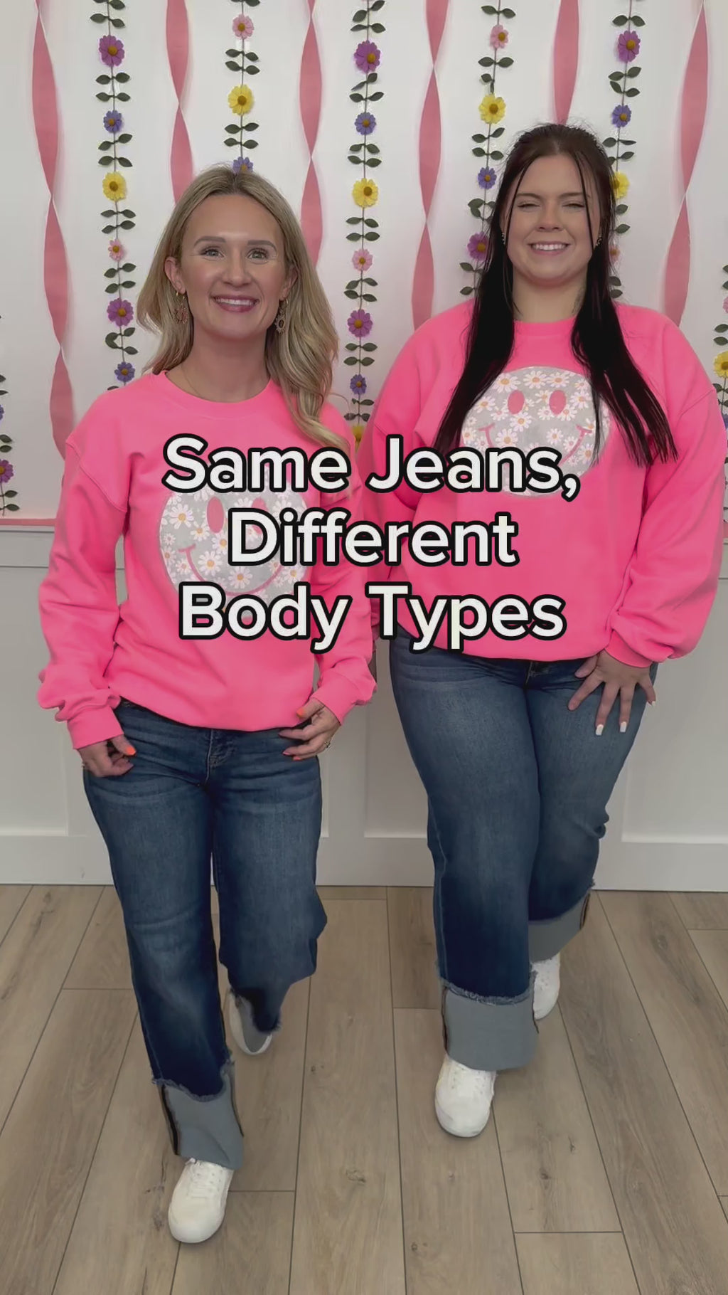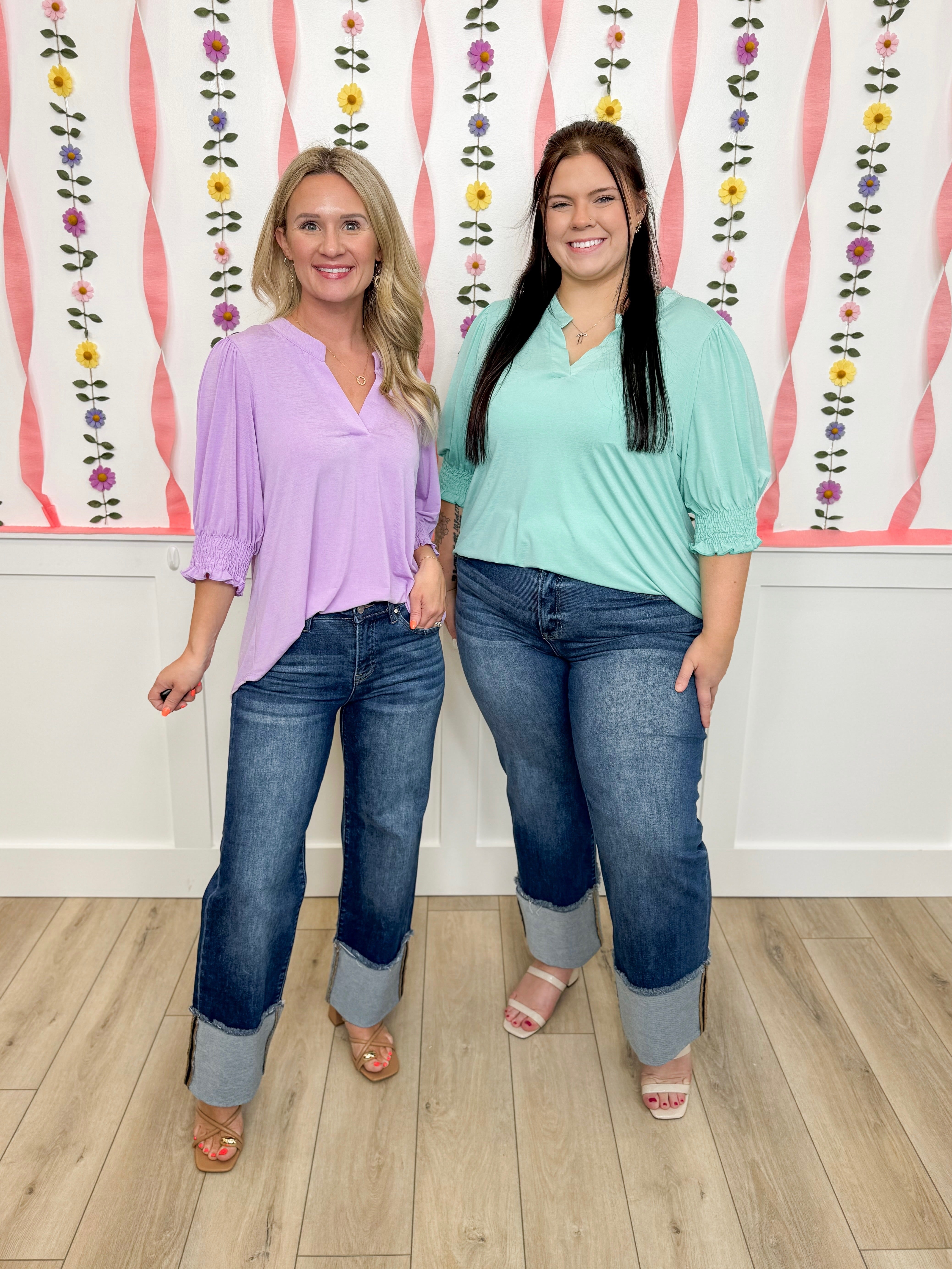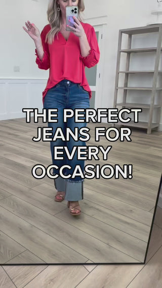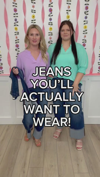 A mid-rise wide-leg jean with a statement cuff and clean dark wash for effortless everyday style.