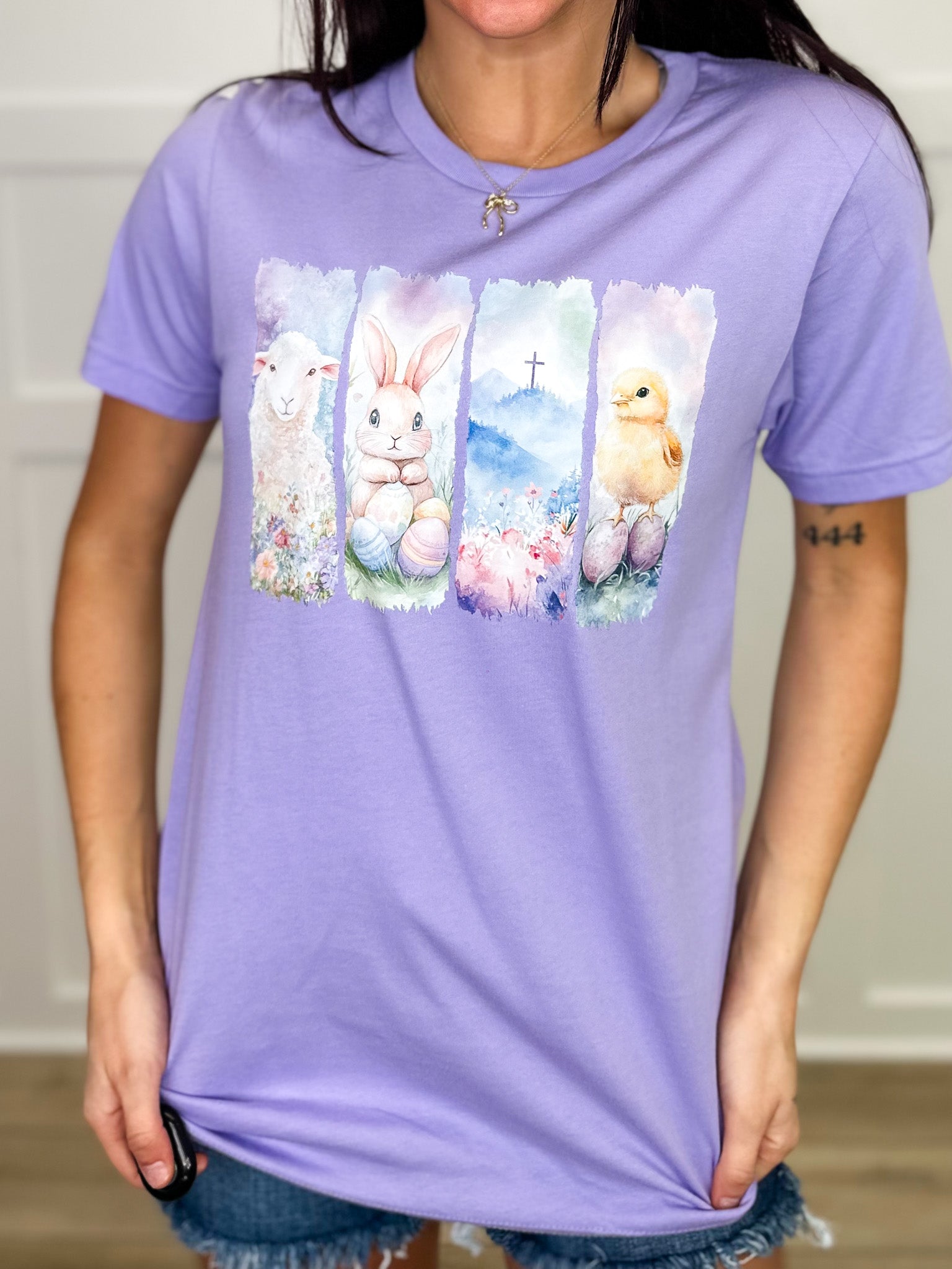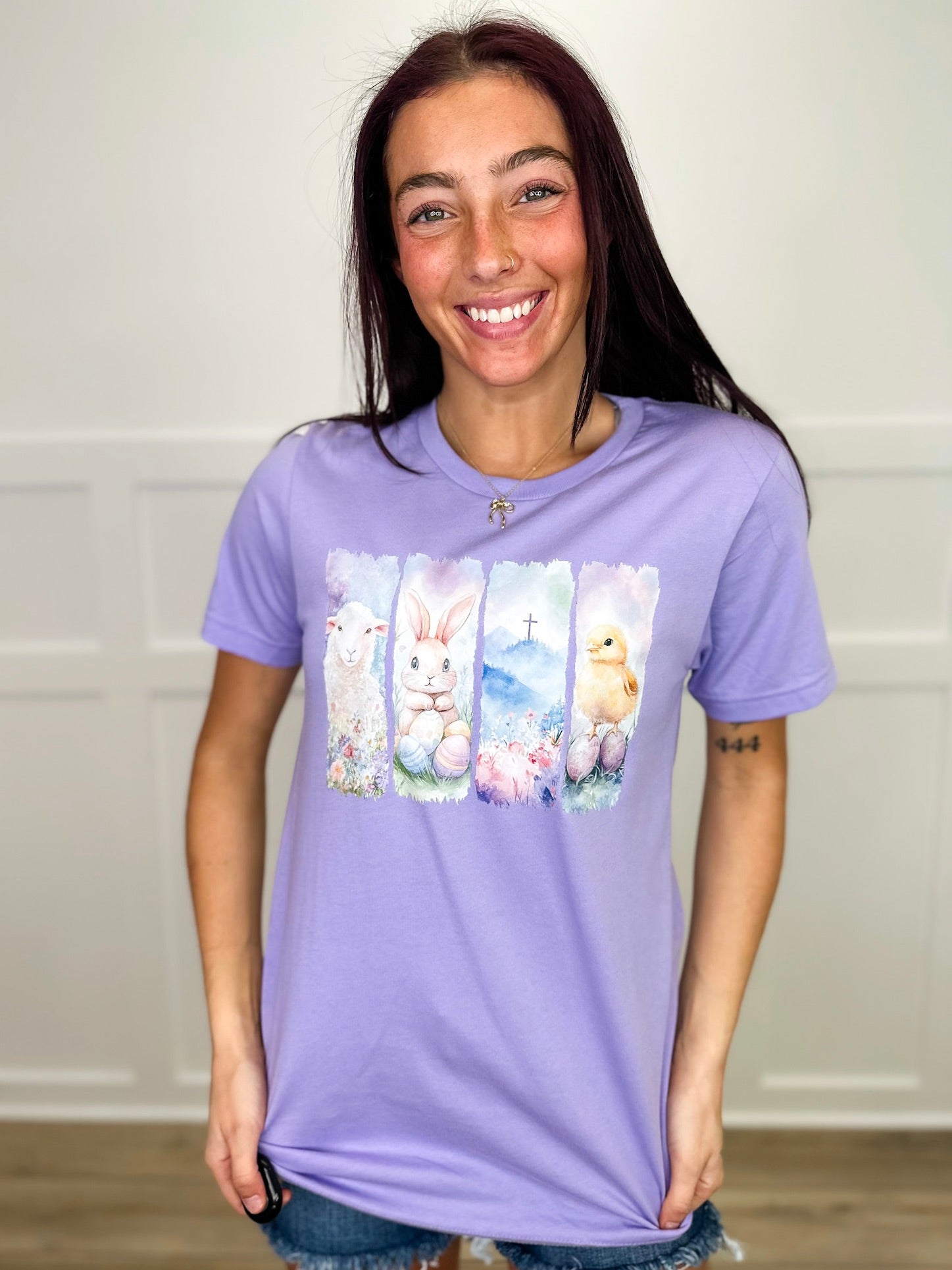 Hop into spring with this delightful cotton tee featuring a whimsical watercolor design celebrating all things Easter! Adorable illustrations of a fluffy lamb, sweet bunny, cheerful chick, and colorful eggs dance across the front in soft, artistic hues of purple and pastels. Perfect for holiday festivities, family gatherings, or anyone who loves charming seasonal style. The short sleeve cut keeps you comfortable while the graphic brings instant joy to your wardrobe. Celebrate the season in playful style!