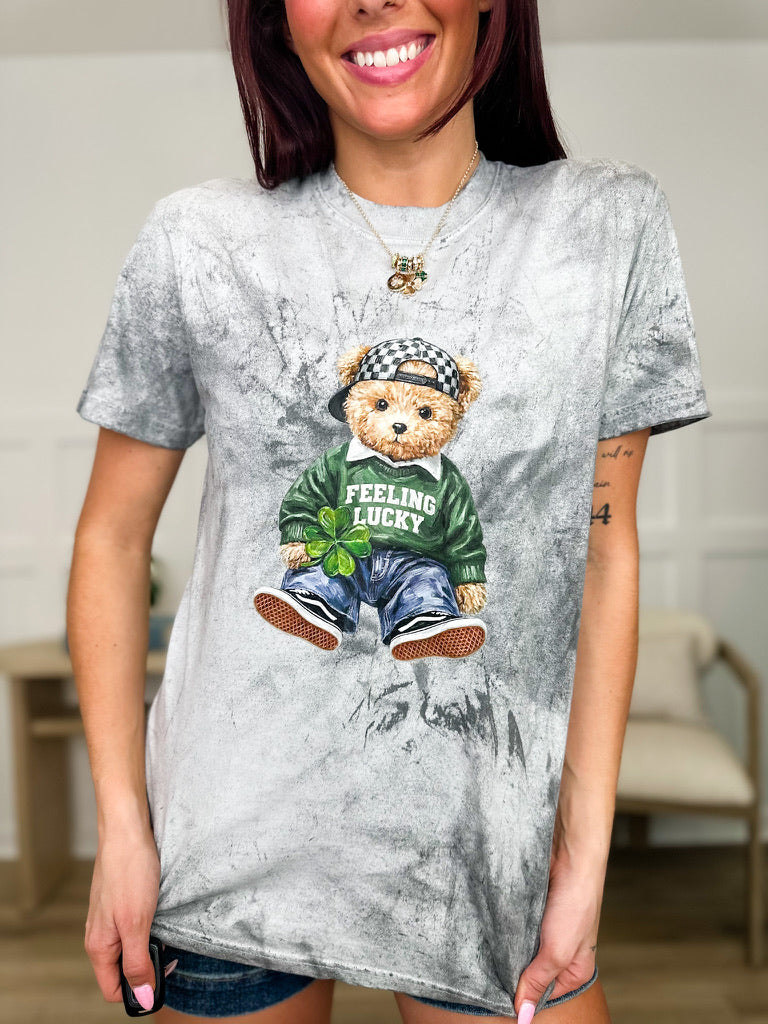 Embrace your lucky side with this charming graphic tee featuring an adorable bear sporting a backwards checkered hat—perfect for spreading St. Patrick's Day vibes year-round. Crafted from soft cotton with a splatter-dyed charcoal finish, this playful shirt combines comfort with whimsical style. Whether you're feeling bear-y lucky or just want to add a touch of fun to your wardrobe, this tee delivers personality in every wear. A must-have for anyone who loves quirky, feel-good fashion.